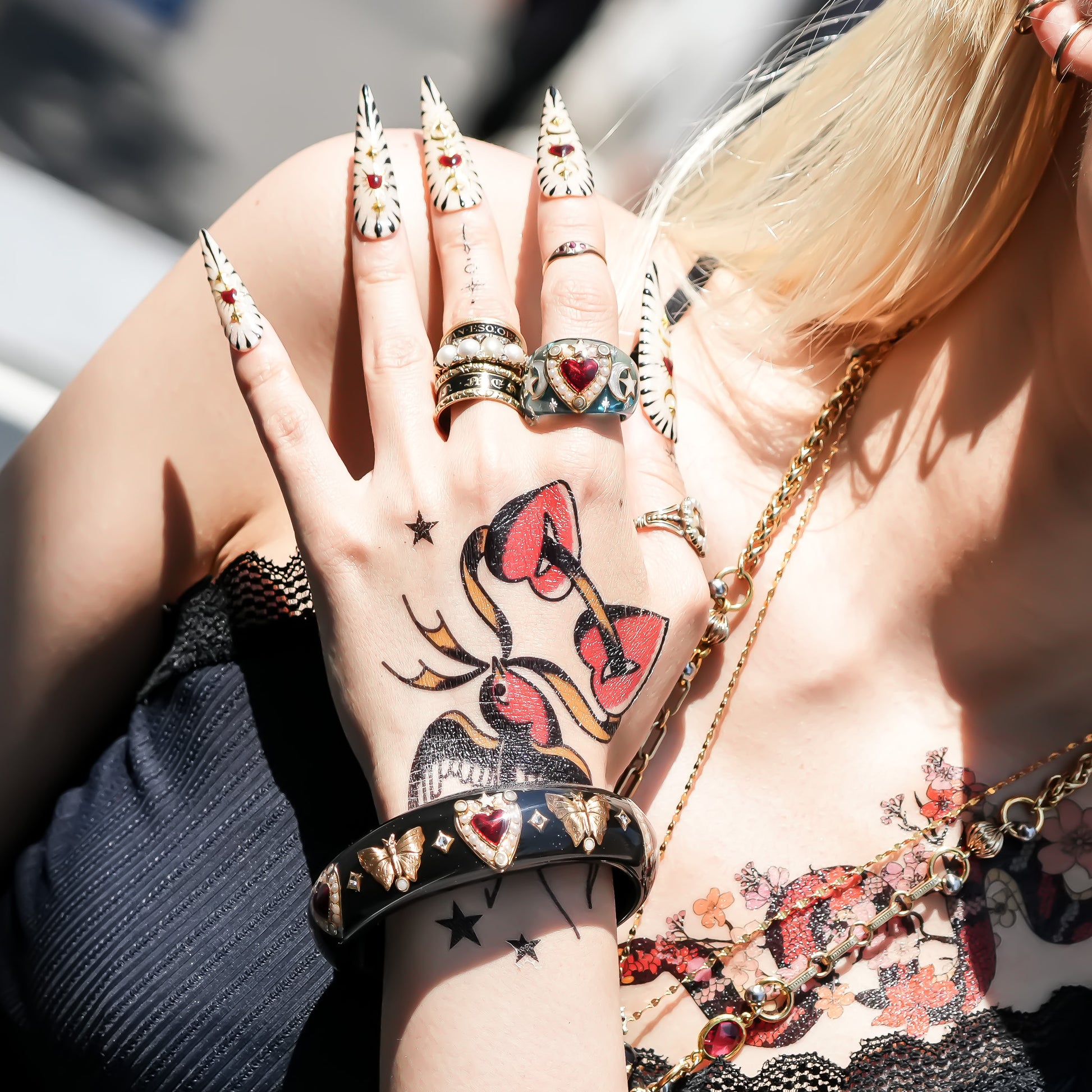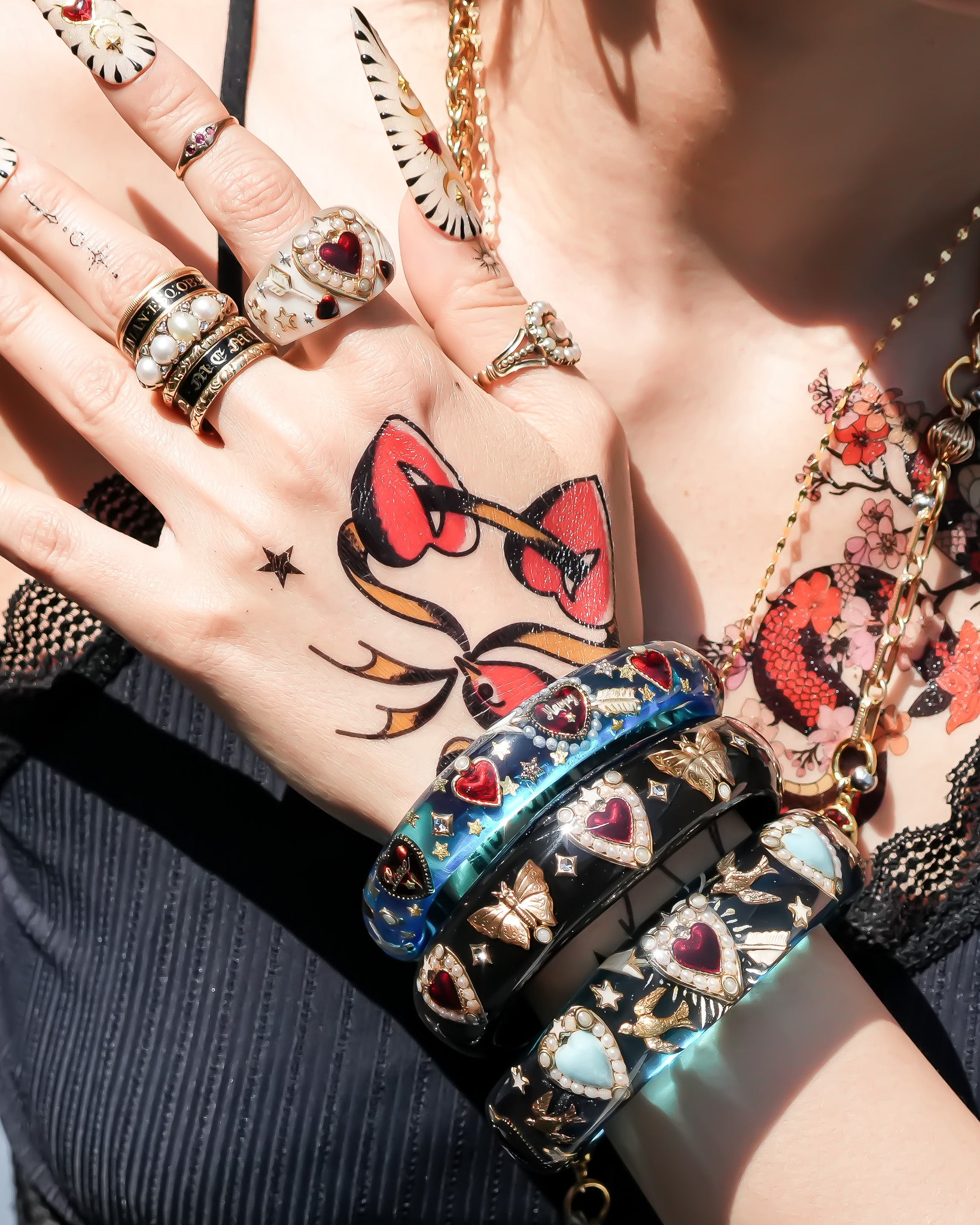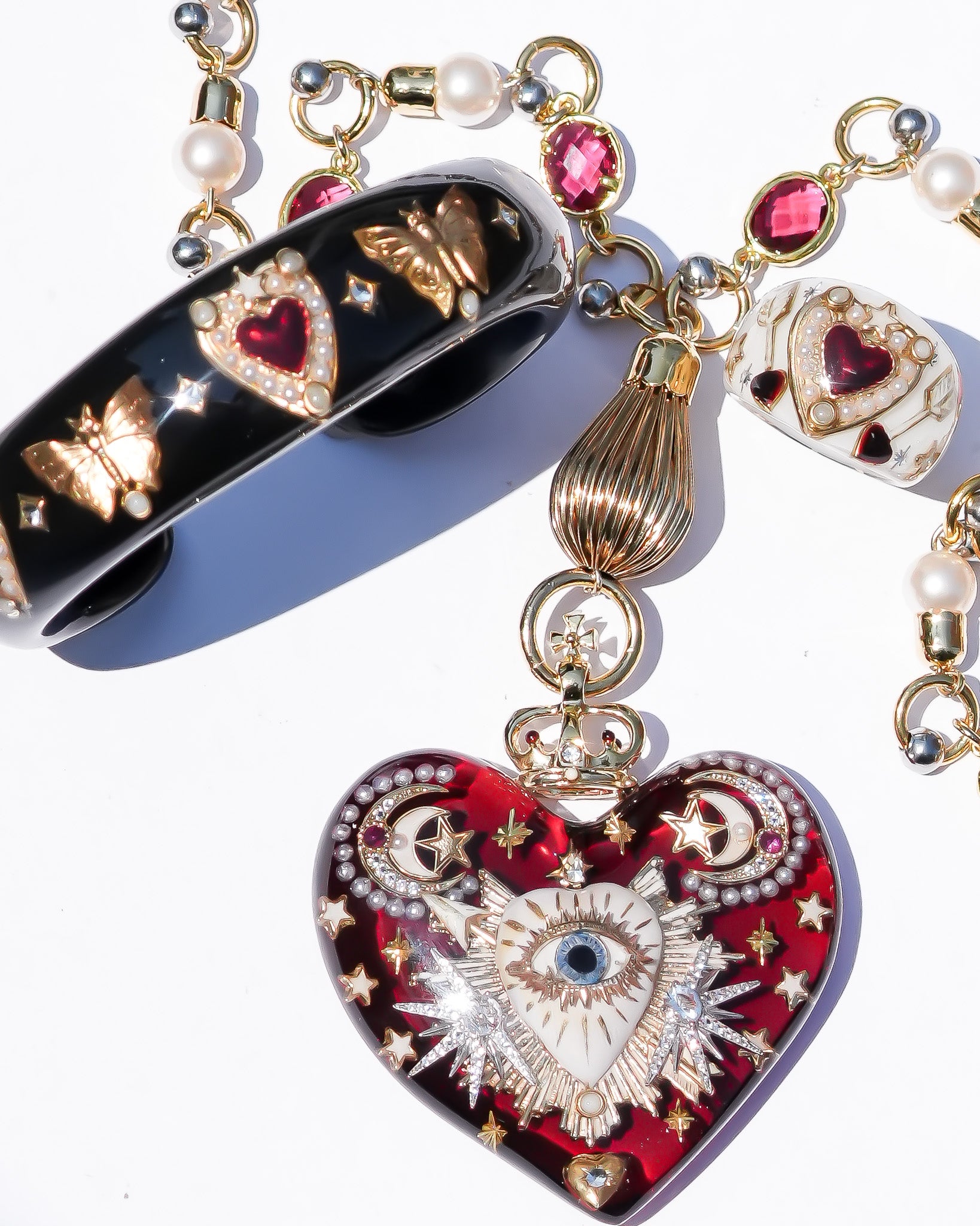Vibrant green and a fiery heart charm. A luxury bangle for adults with attention to detail.