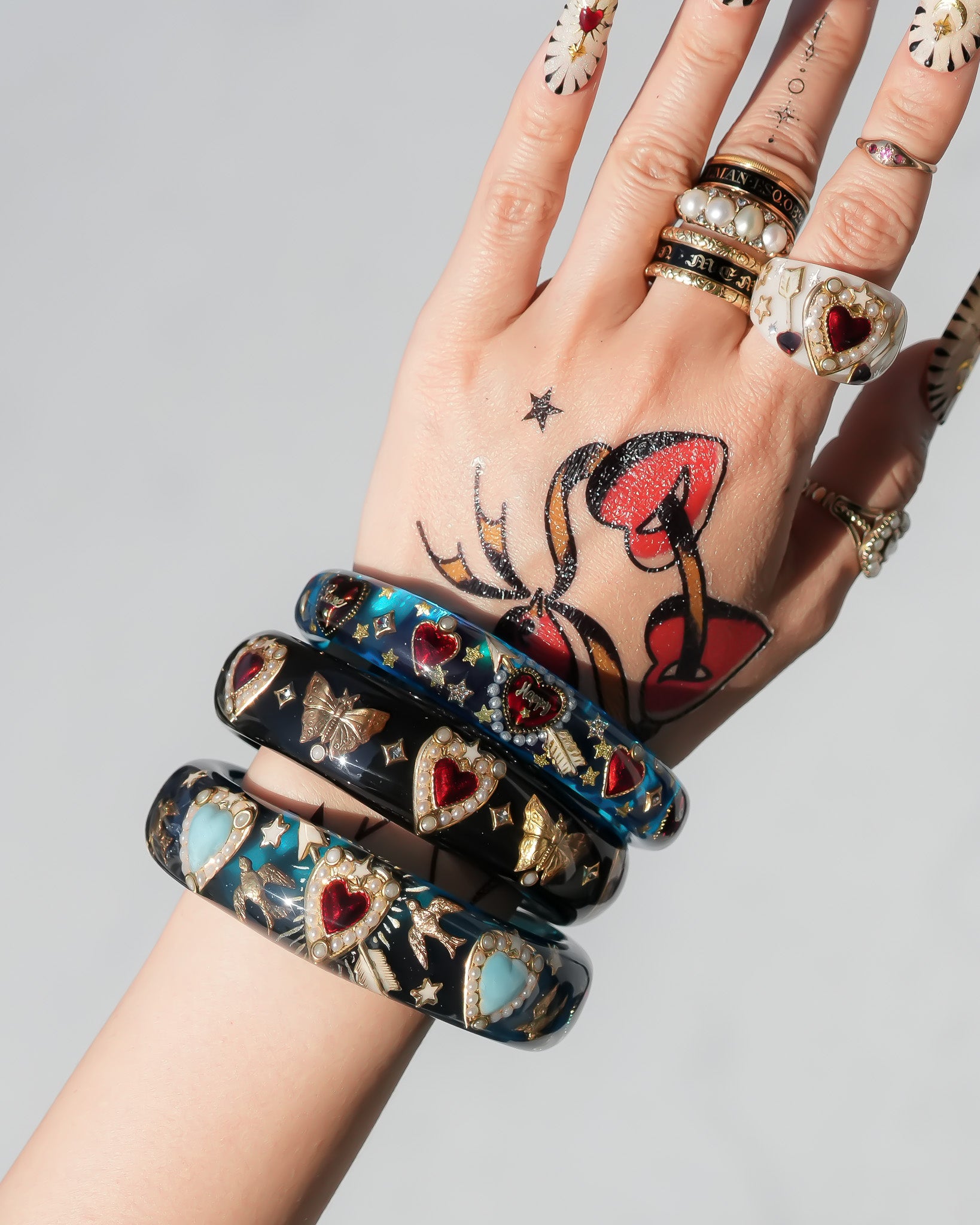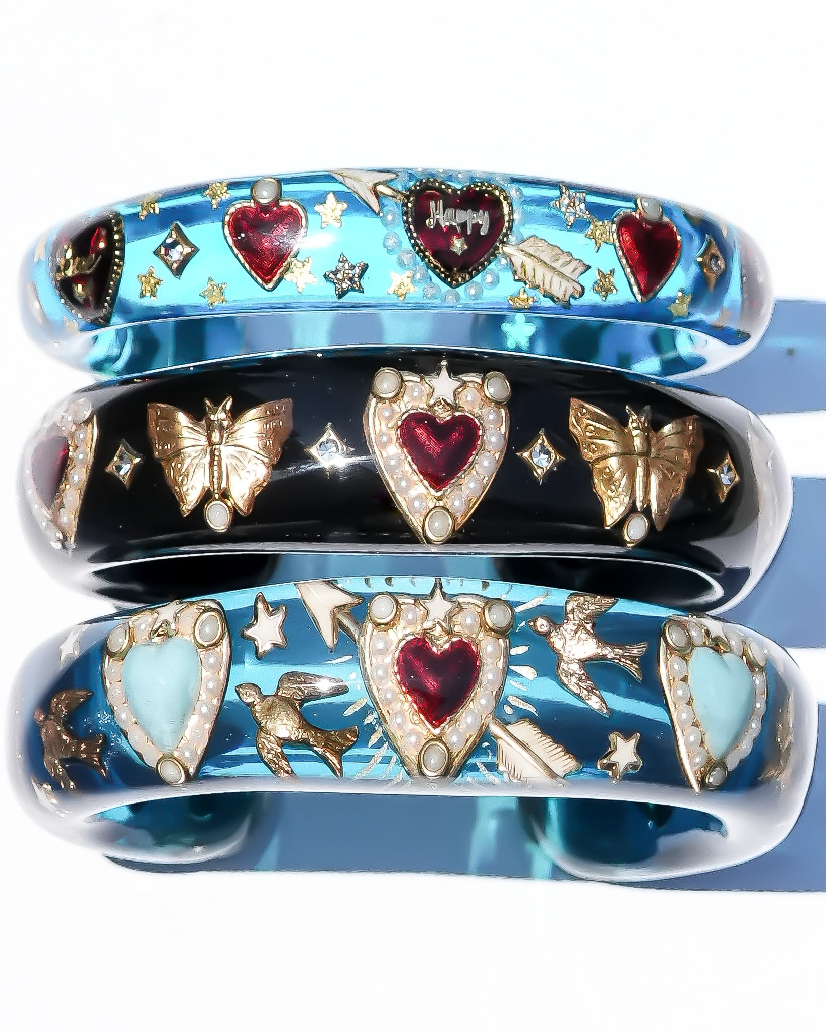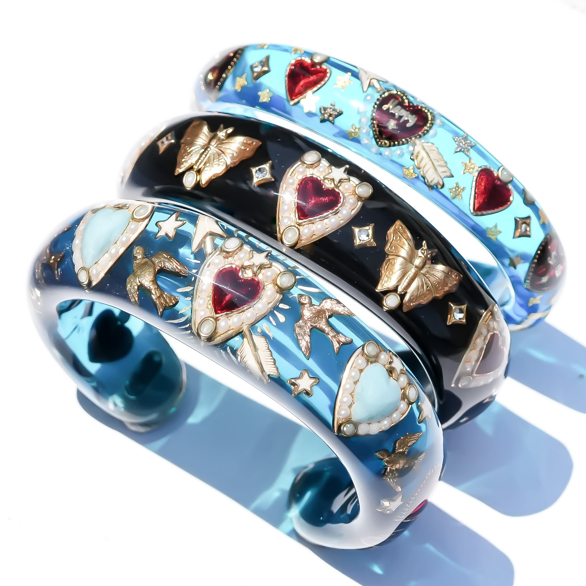 We have created an exciting bangle by luxuriously encasing antique charms purchased in France (Paris) in resin!