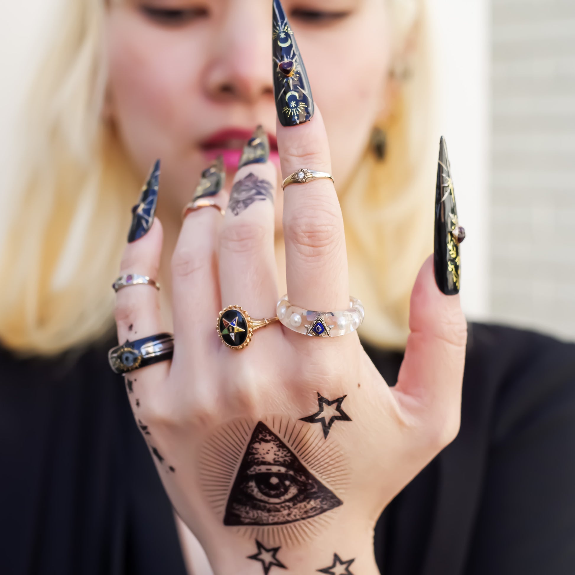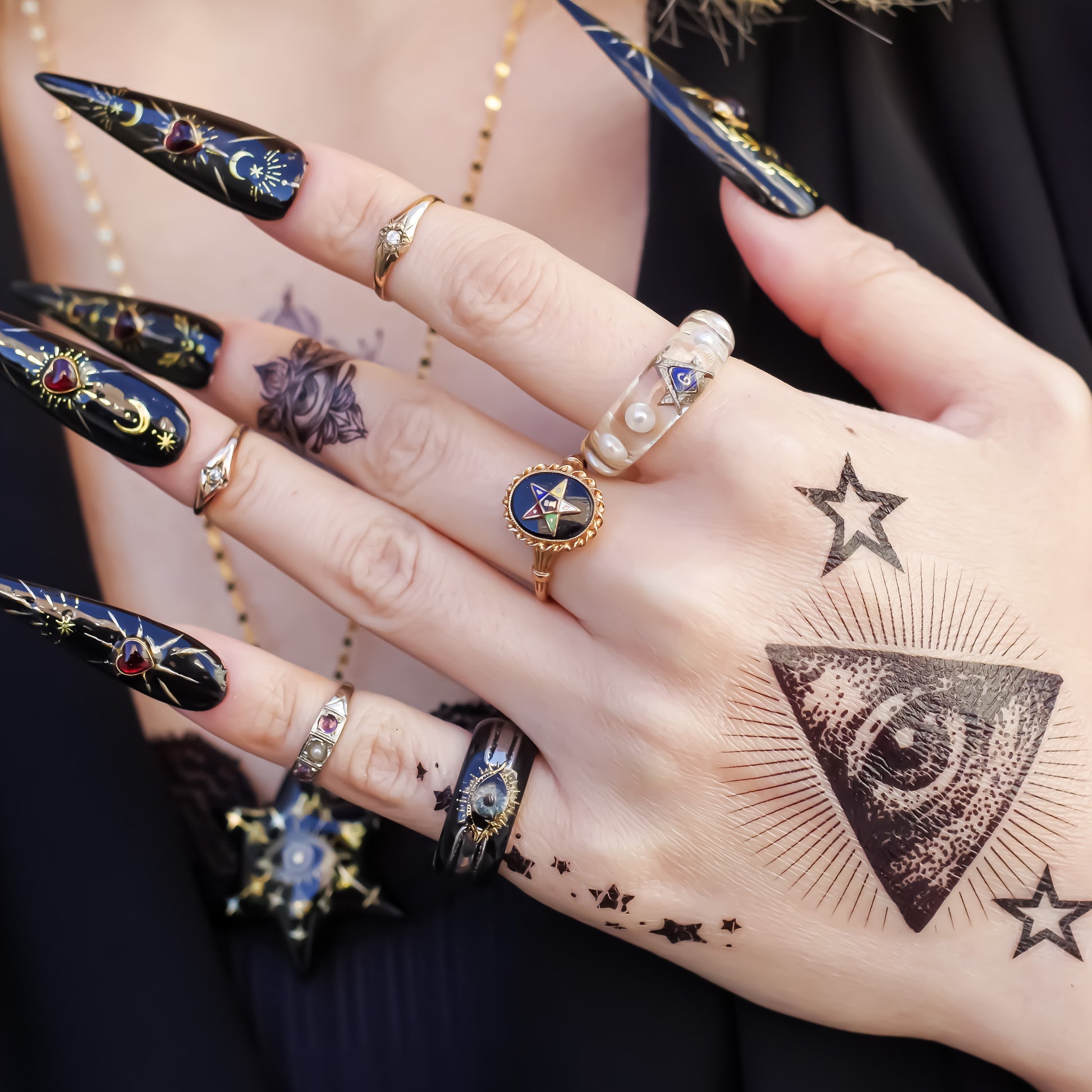 This is a one-of-a-kind ring containing vintage Freemason jewelry (charms, pin brooches, parts, etc.) purchased in the UK and the US .