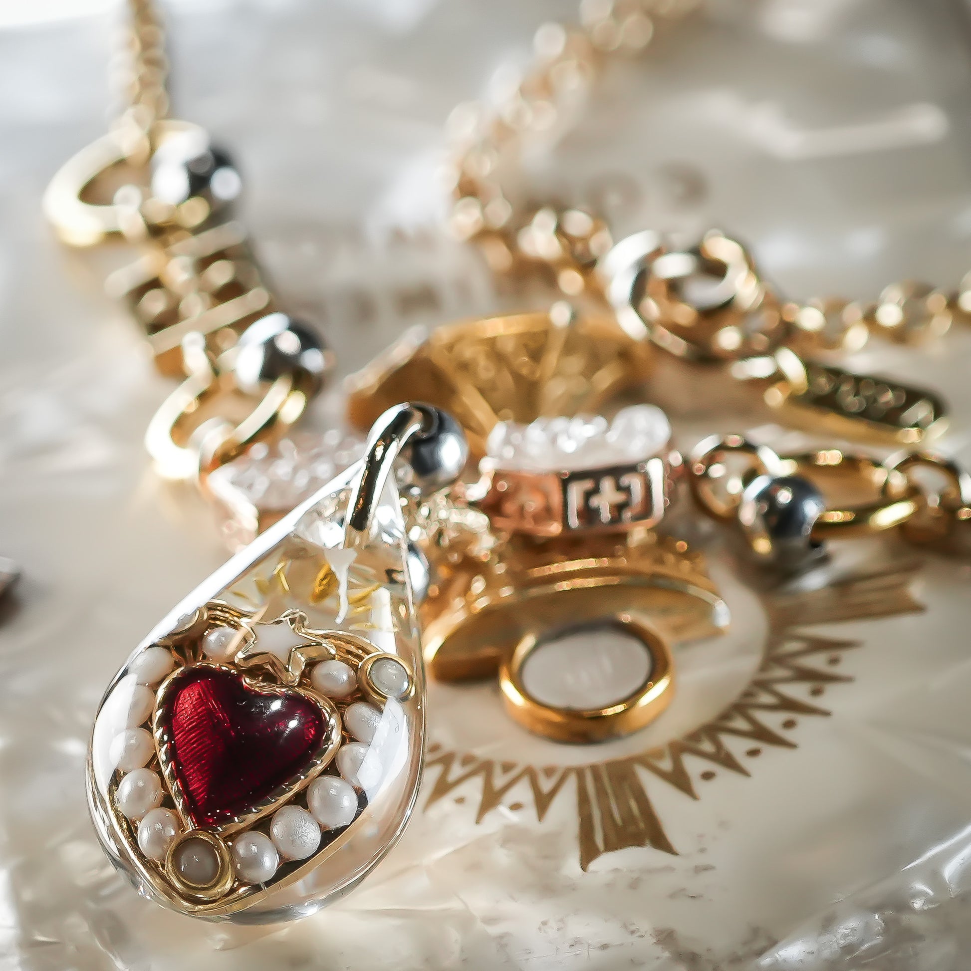ドロップの中にフランスで買い付けて来たアンティークのハートチャームが入ったネックレスです。