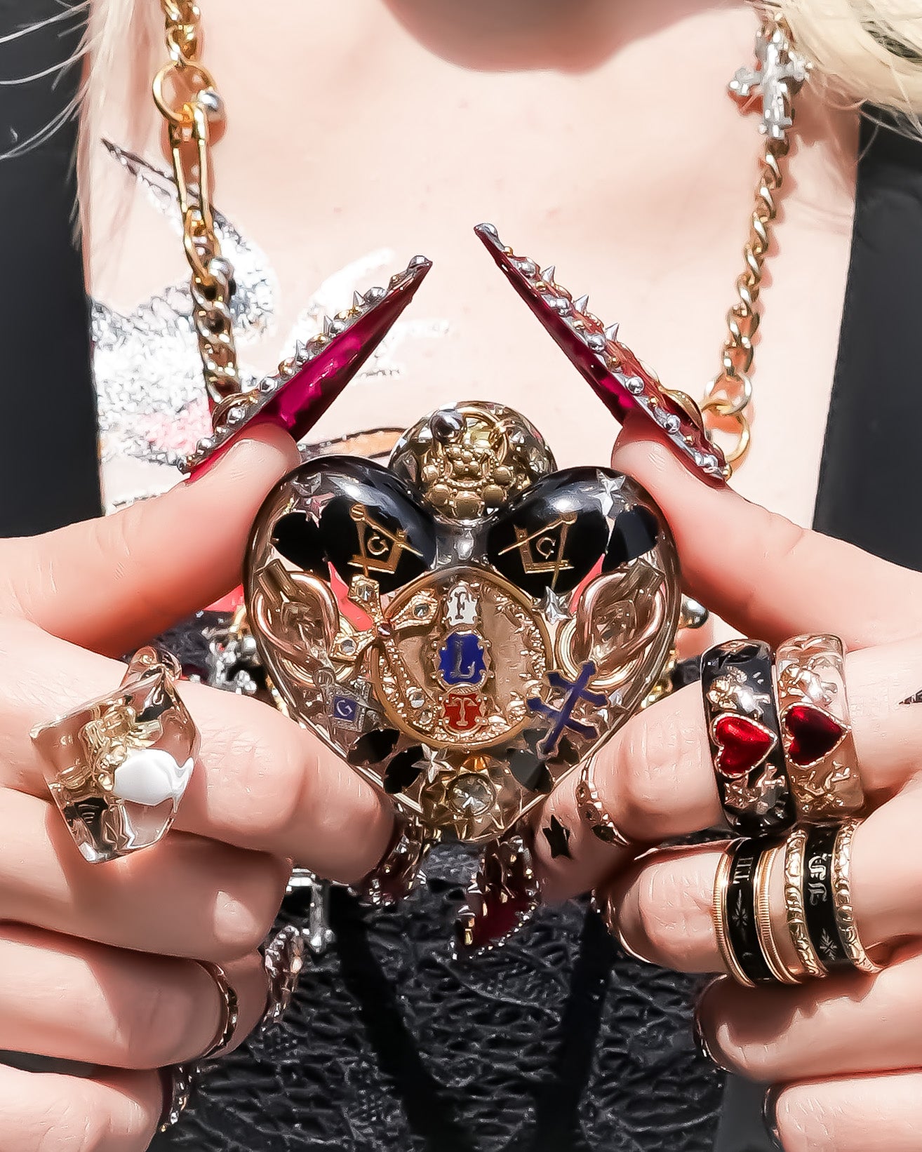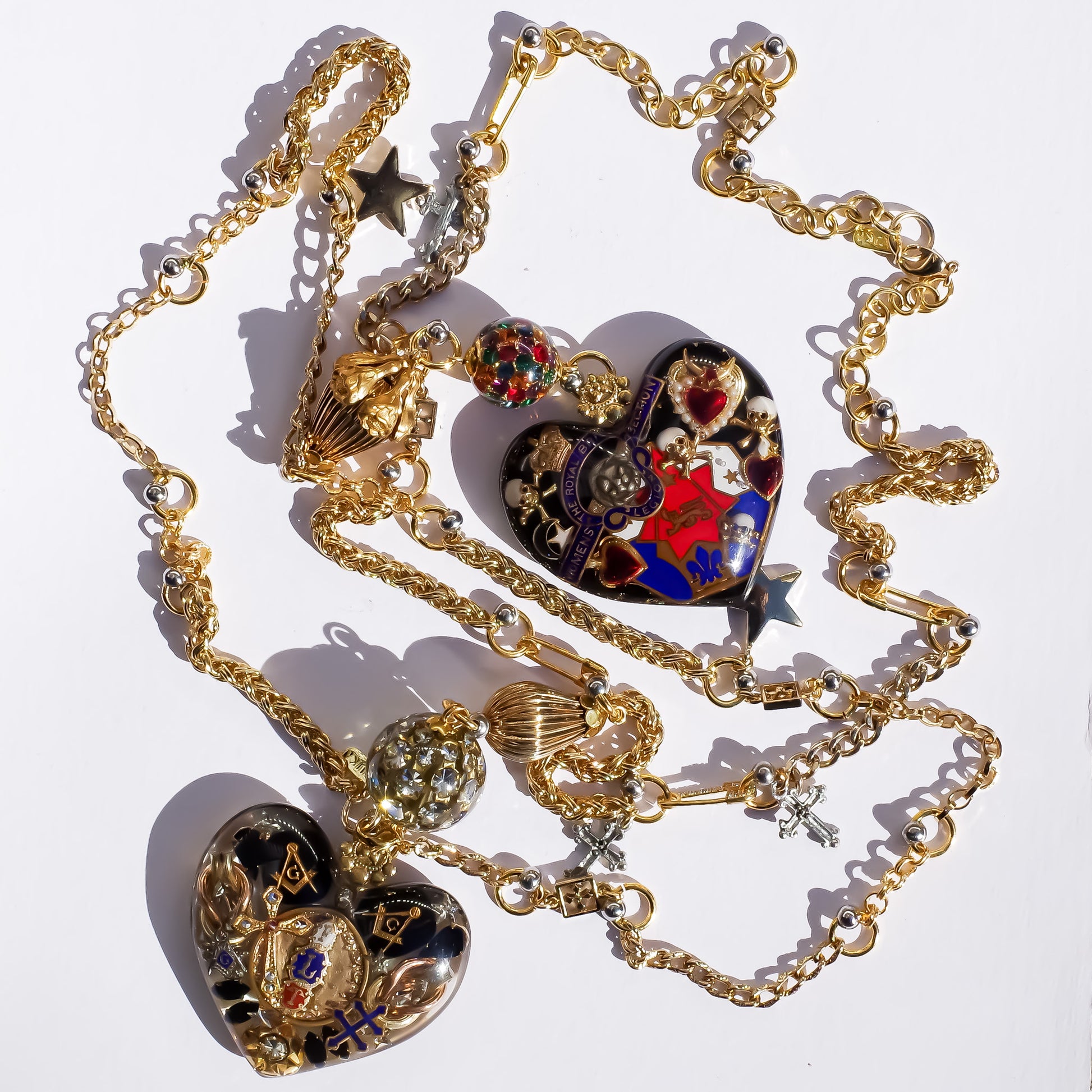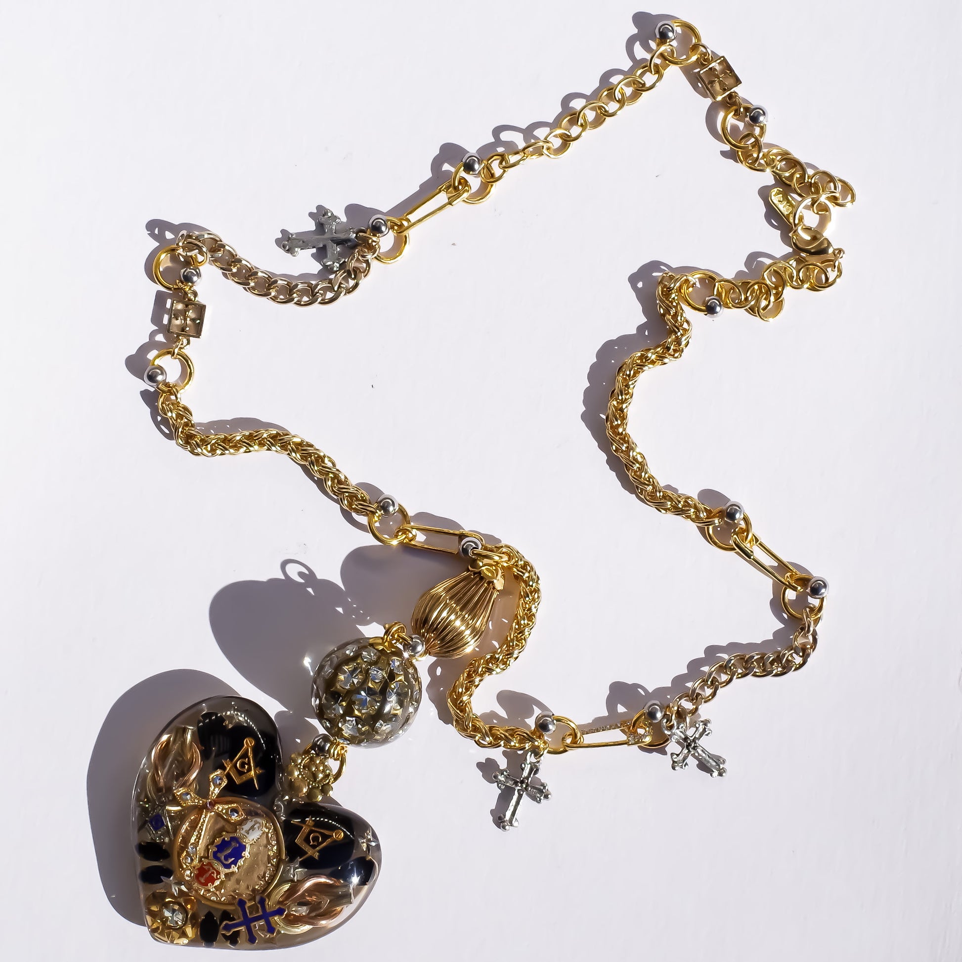 大きなハートのペンダントトップに目のモチーフのハートやスカル、スターなどがちりばめられたネックレスです。