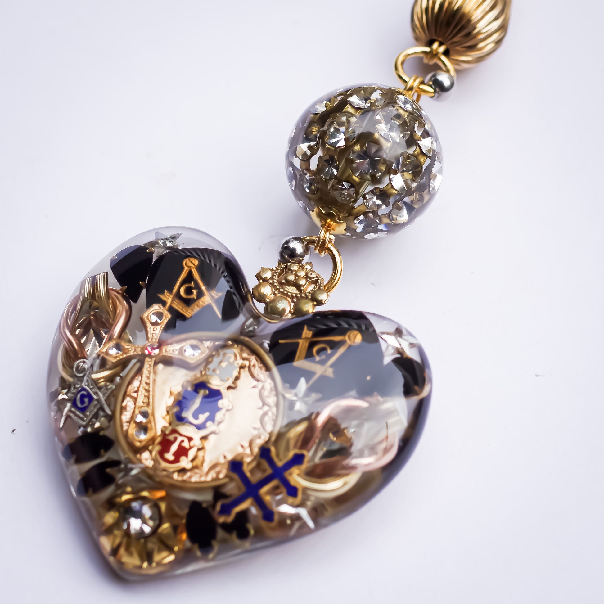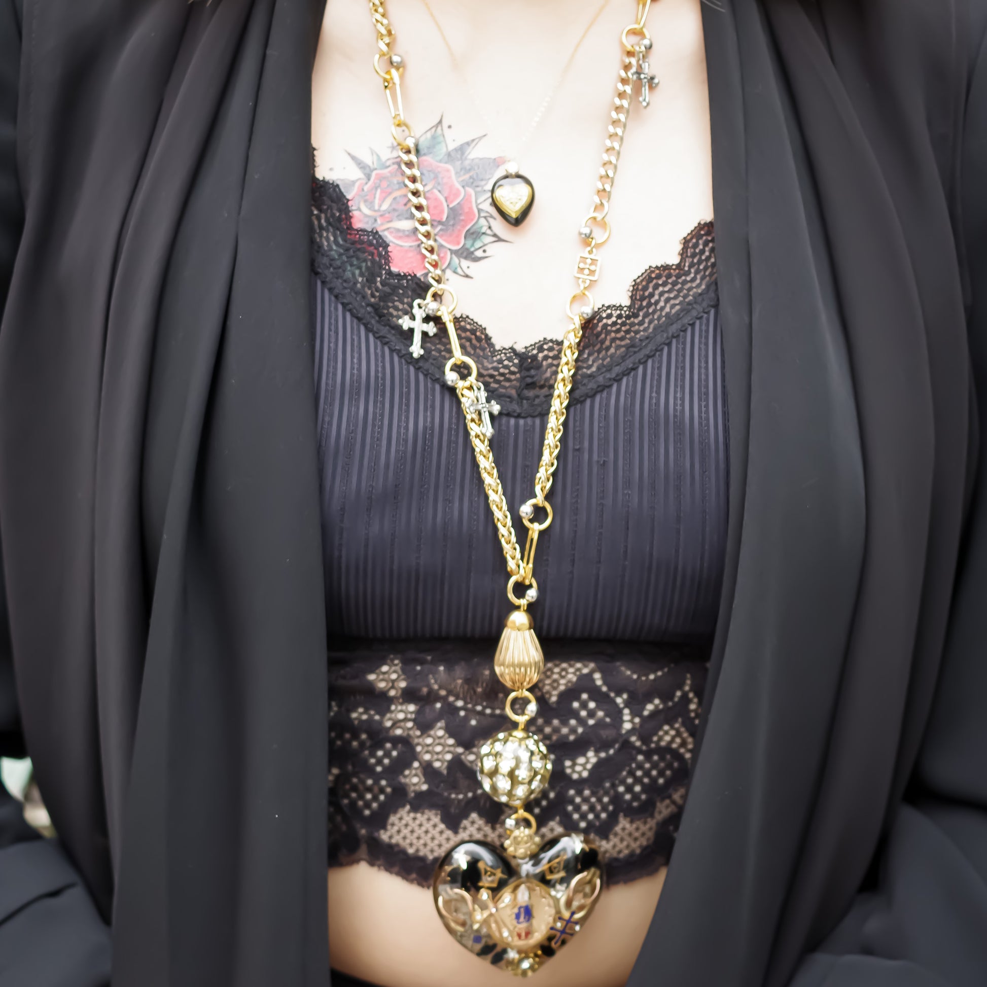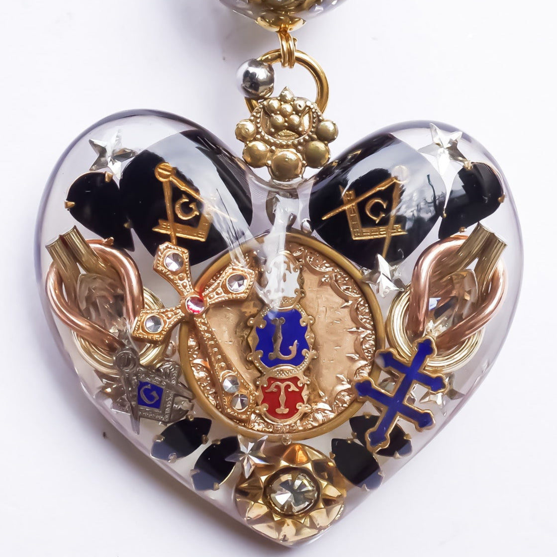 大きなハートのペンダントトップに目のモチーフのハートやスカル、スターなどがちりばめられたネックレスです。
