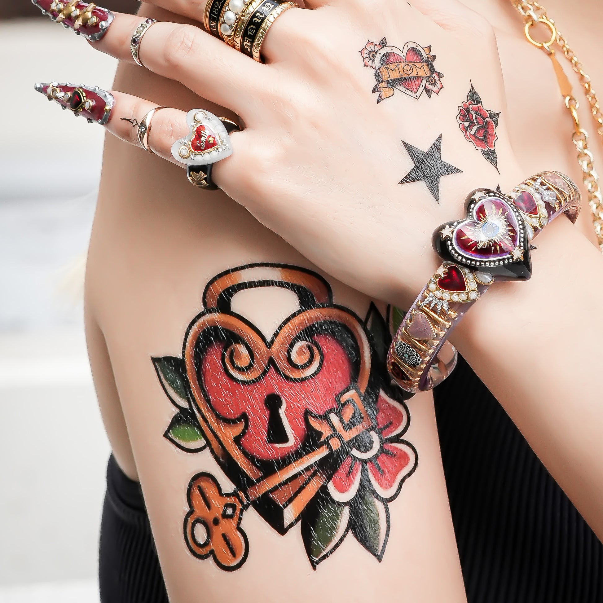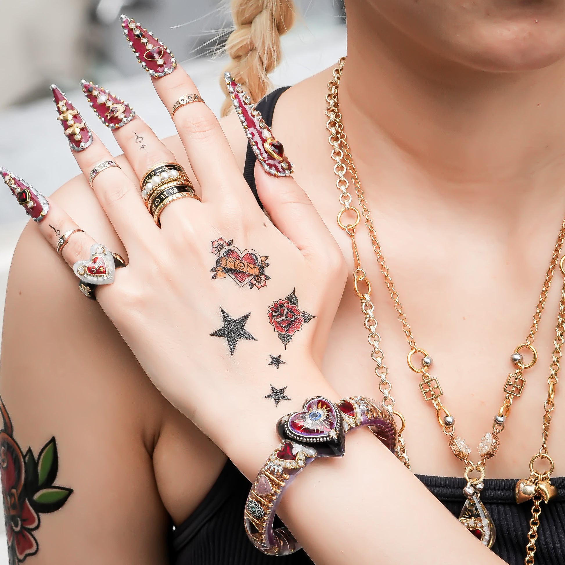 サイドにはターコイズやピンクハート、月や星のヴィンテージチャームが散りばめられ、