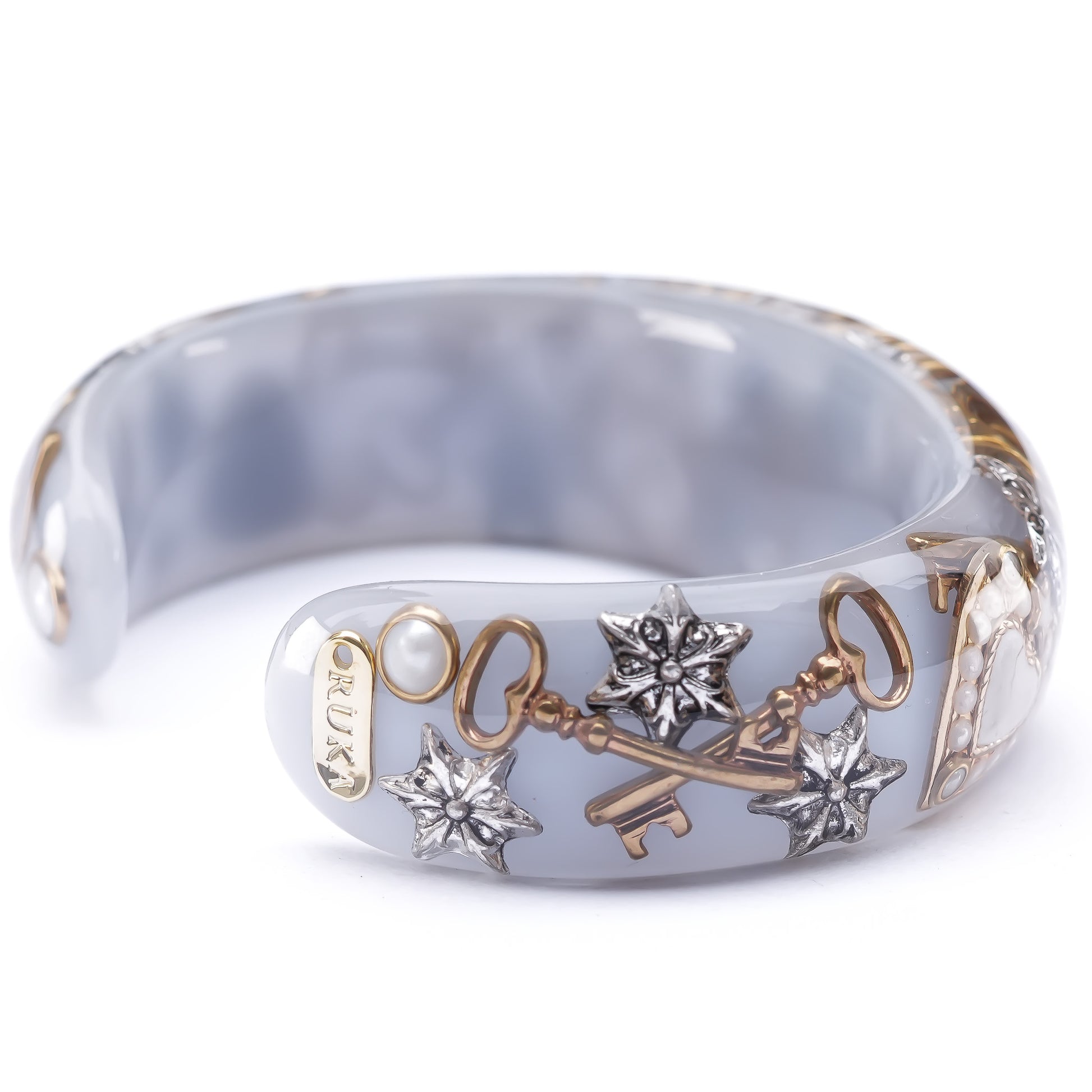 やわらかなスモーキーグレーに、白いハートと鍵が優雅に並ぶ幻想的なデザイン。