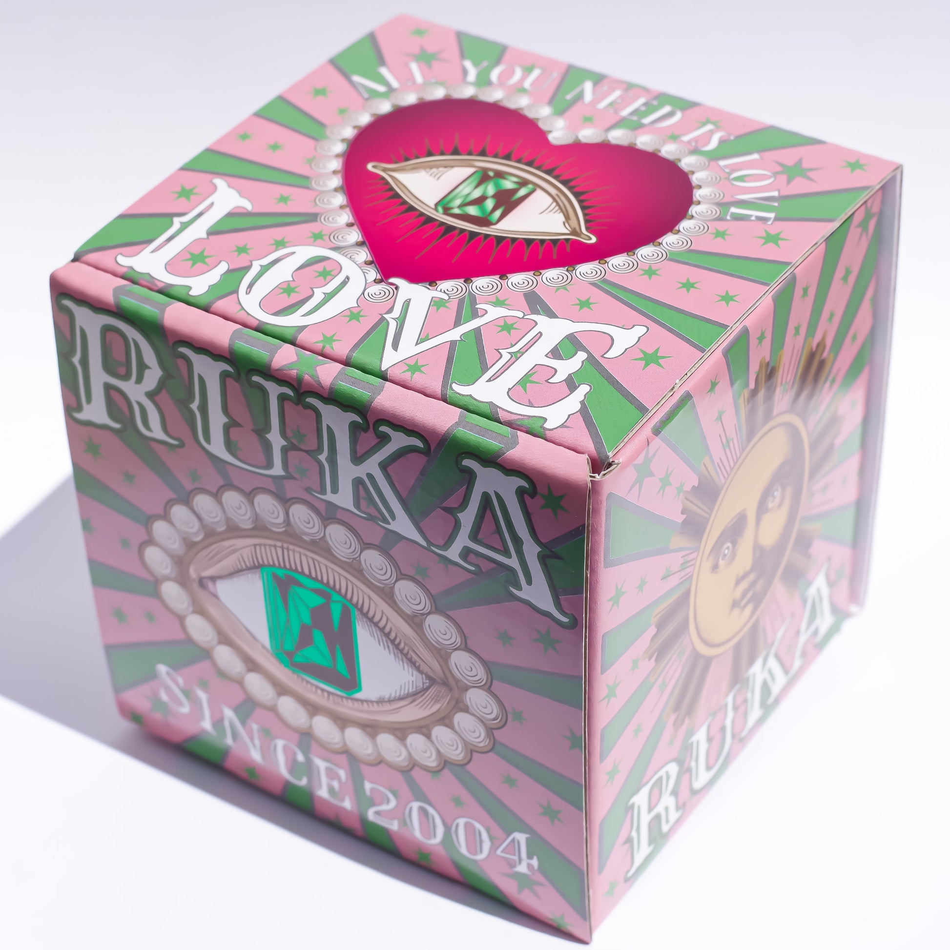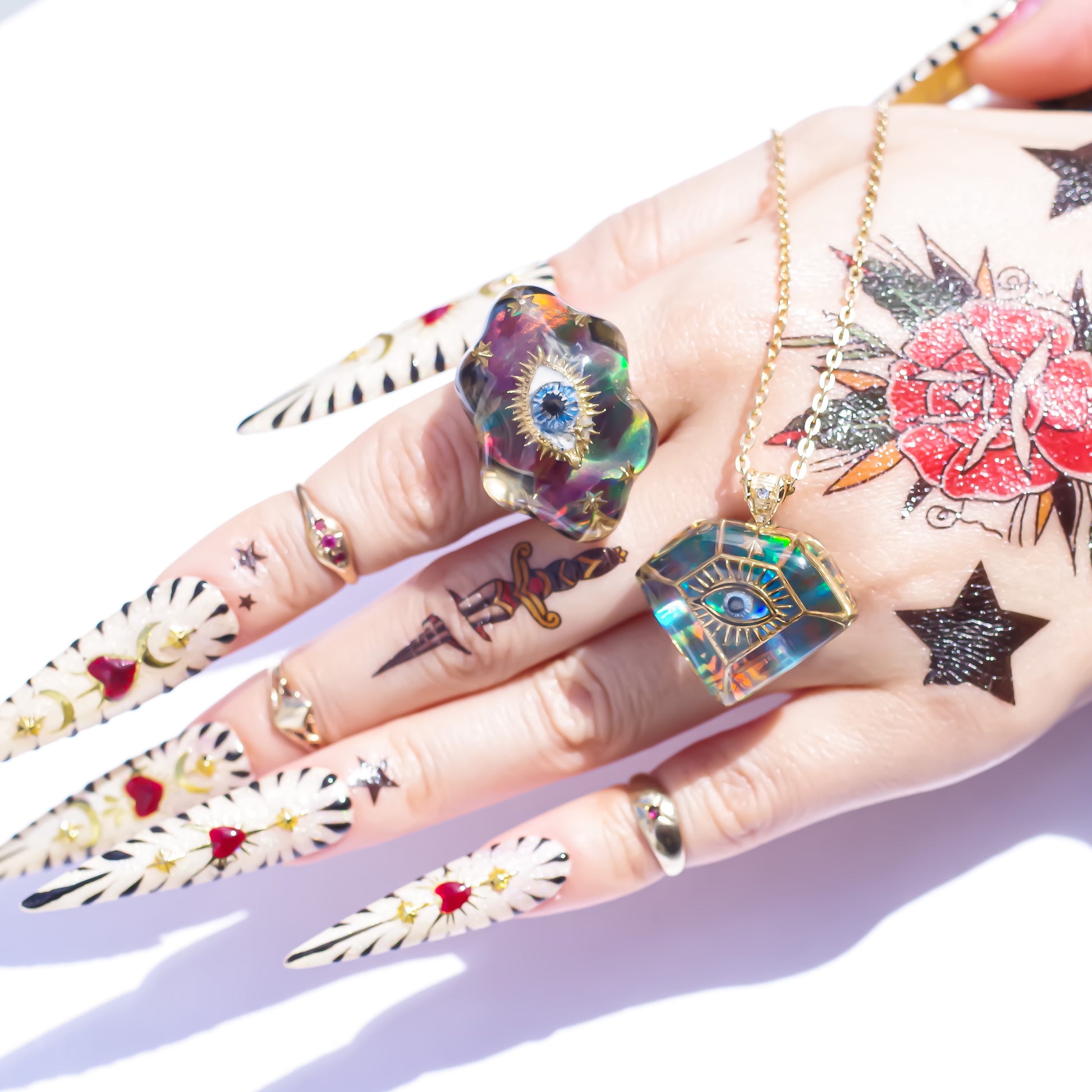 角度によって表情を変える虹色の輝きと、中央に描かれた「目」が強い存在感を放ちます。