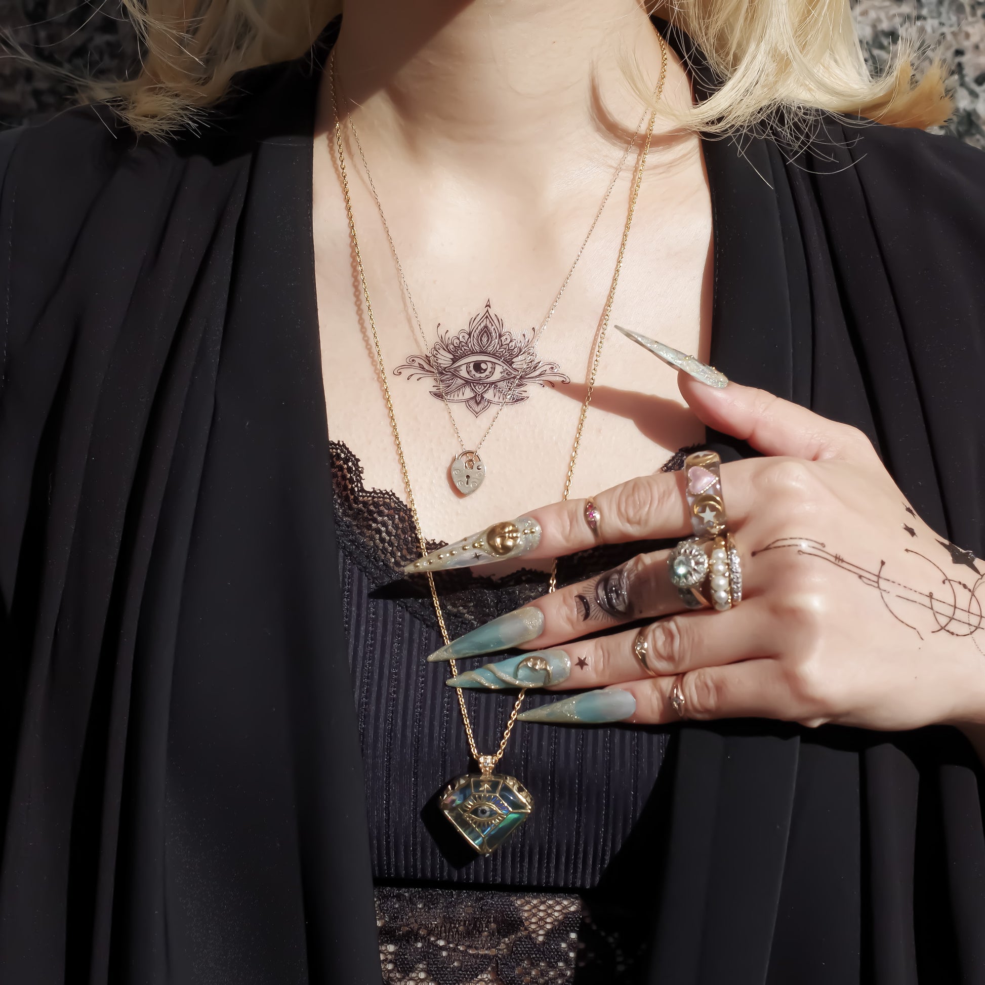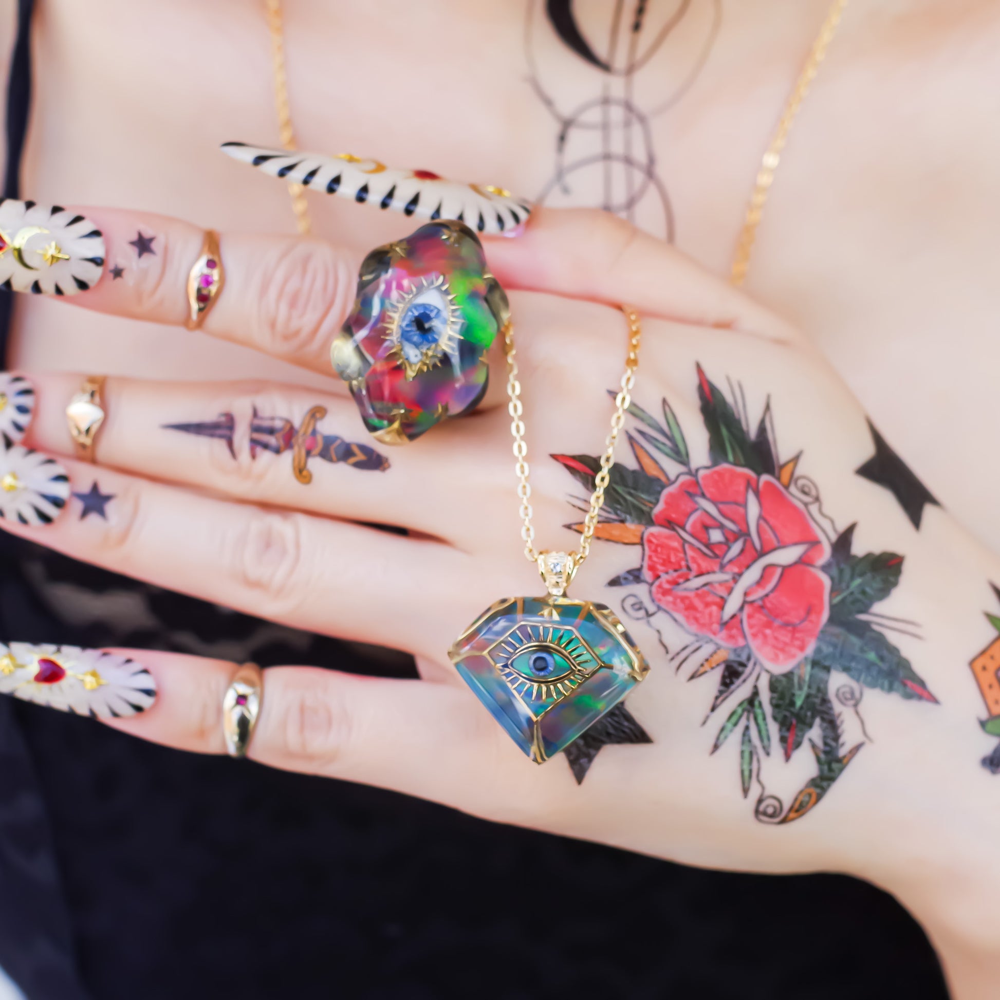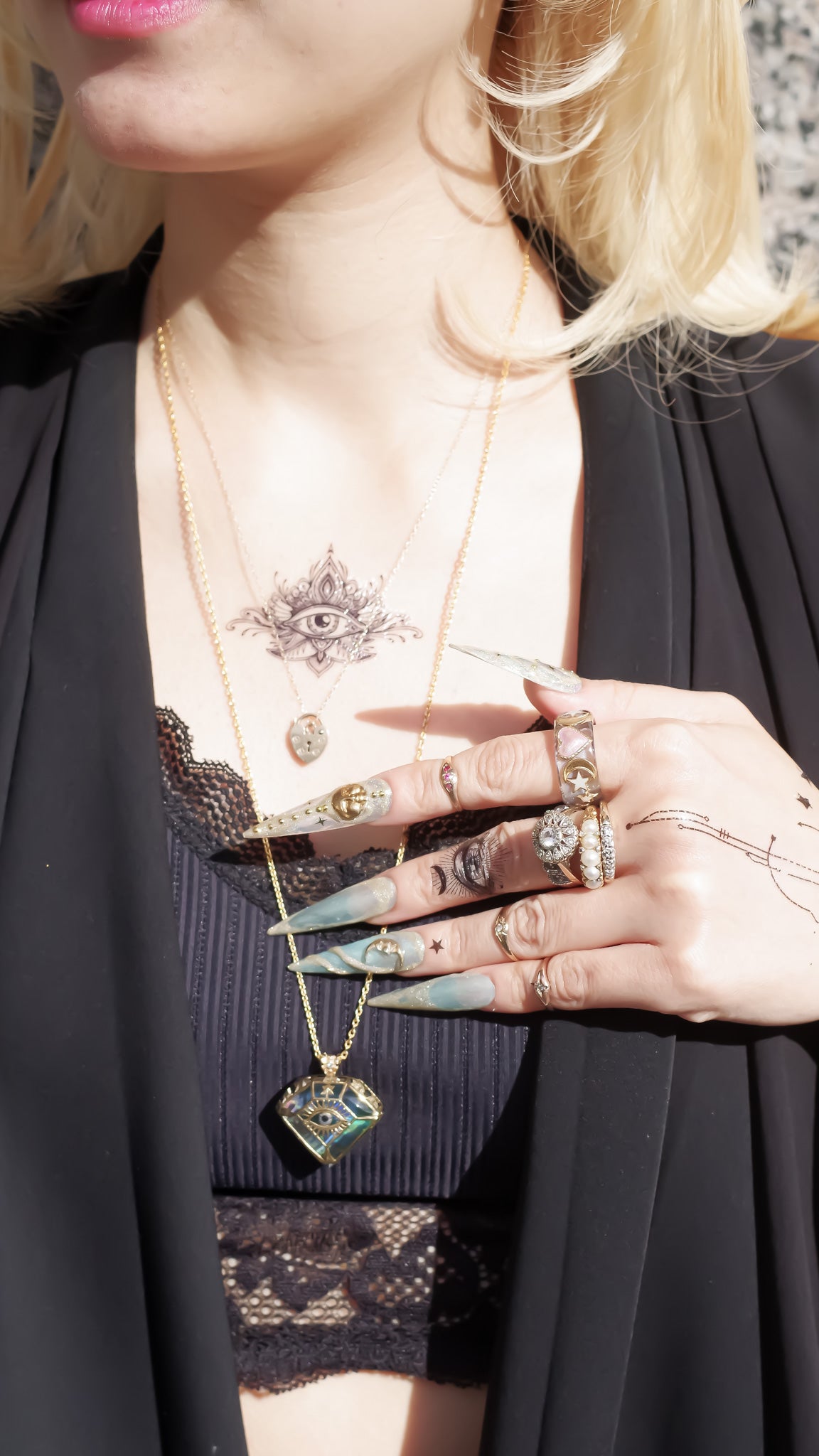 オーロラ・オパール・ガラスを使用した、ダイヤモンド型のアイモチーフネックレス。