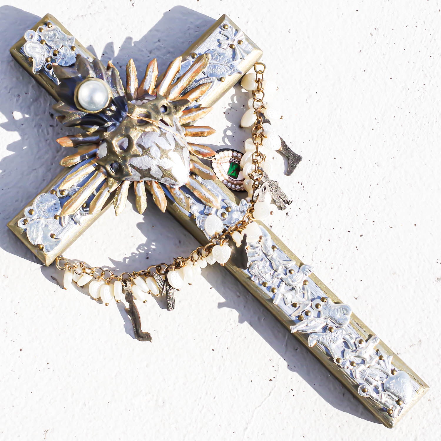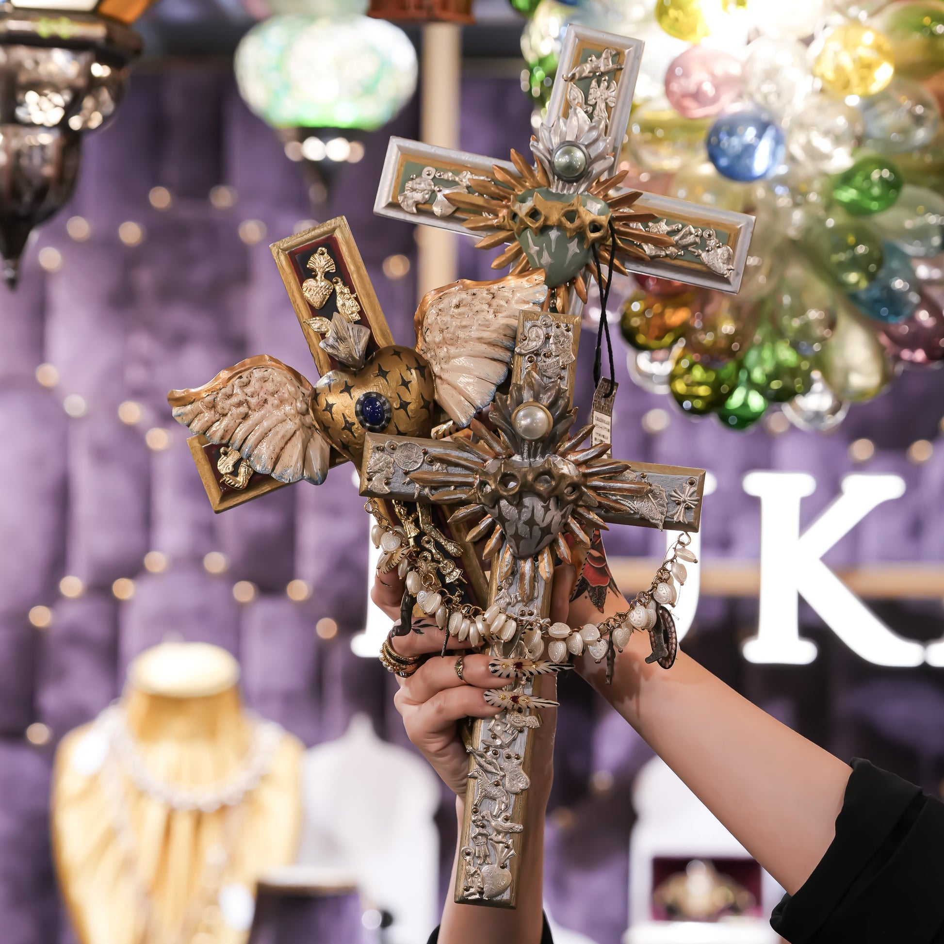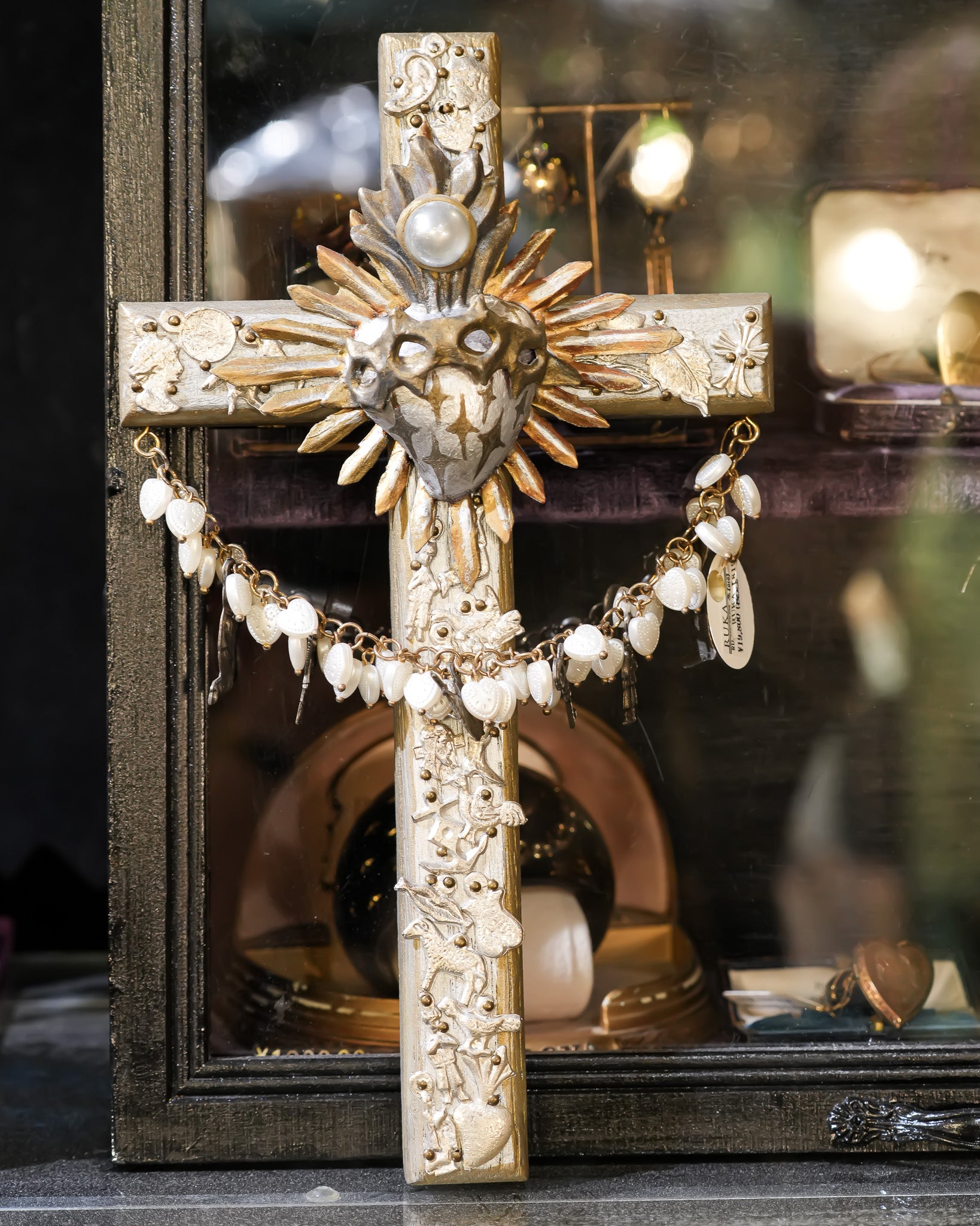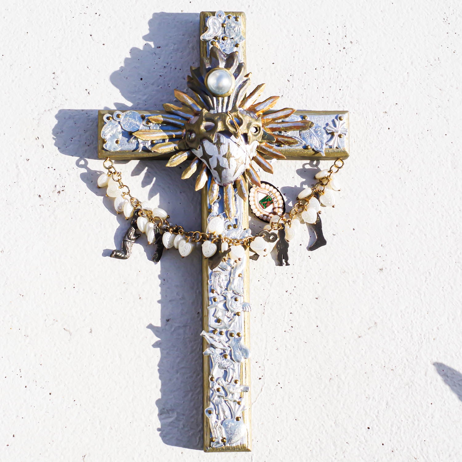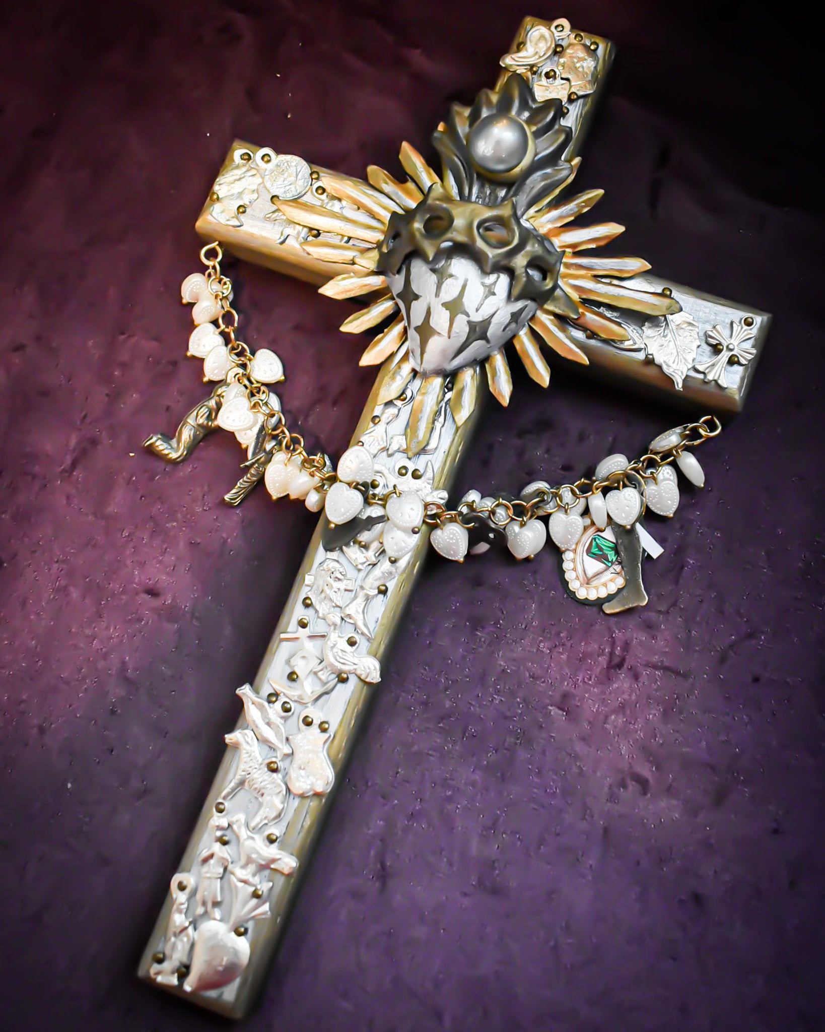 クロスには沢山のミラグロが打ち付けられており、真ん中にはハートがデザインされております。