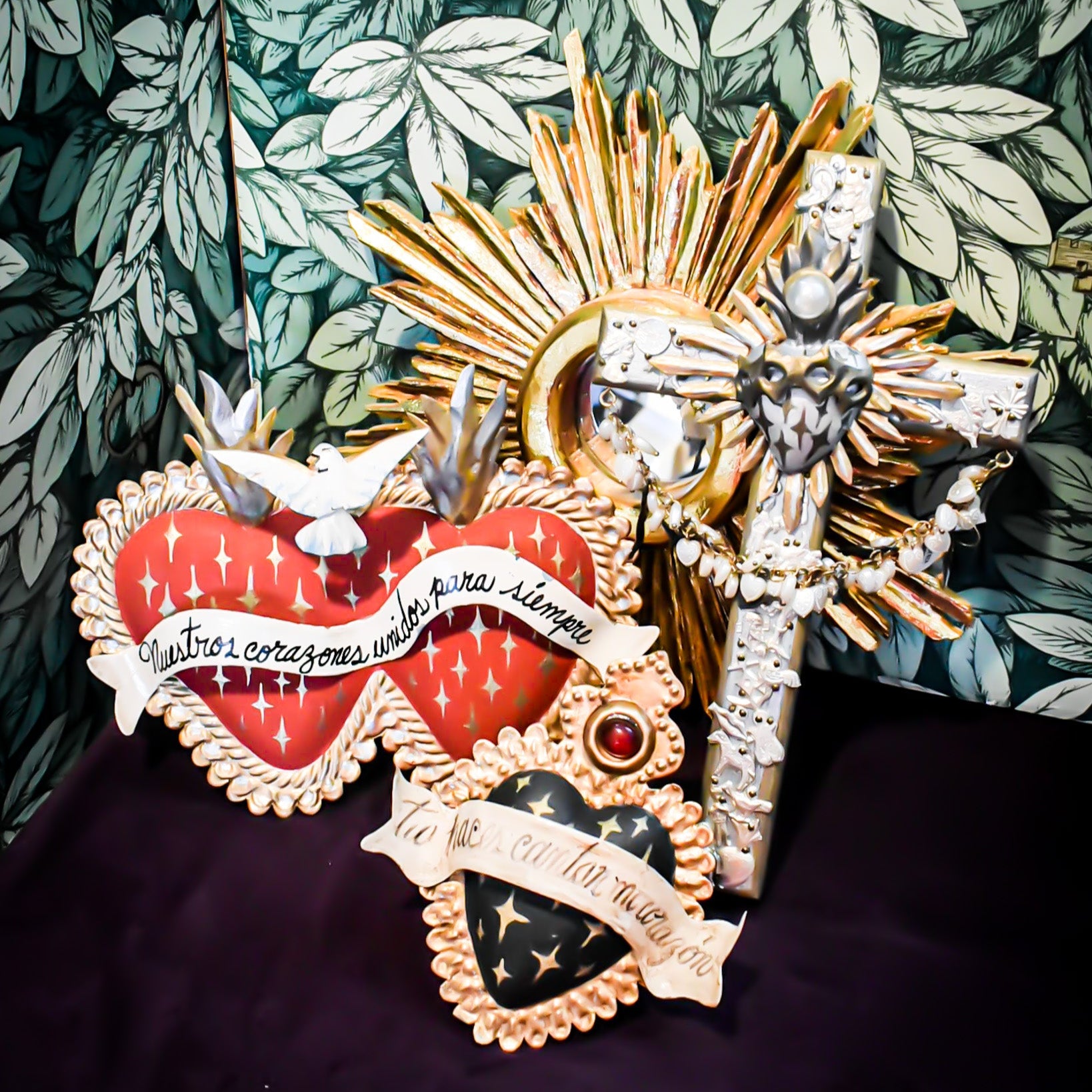 メキシコで伝統的に使用されているメタルのチャームで癒してほしいところ(身体の一部や、動物、農作物など)を形にして身に着けたり、教会へ奉納したりして、聖人に確認してもらうお守りのようなものです。メキシコでは十字架やハートのモチーフに打ち付けた壁飾りがありとても人気です。