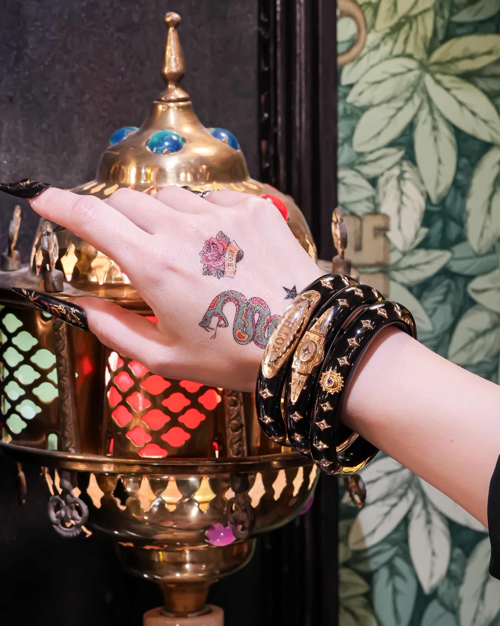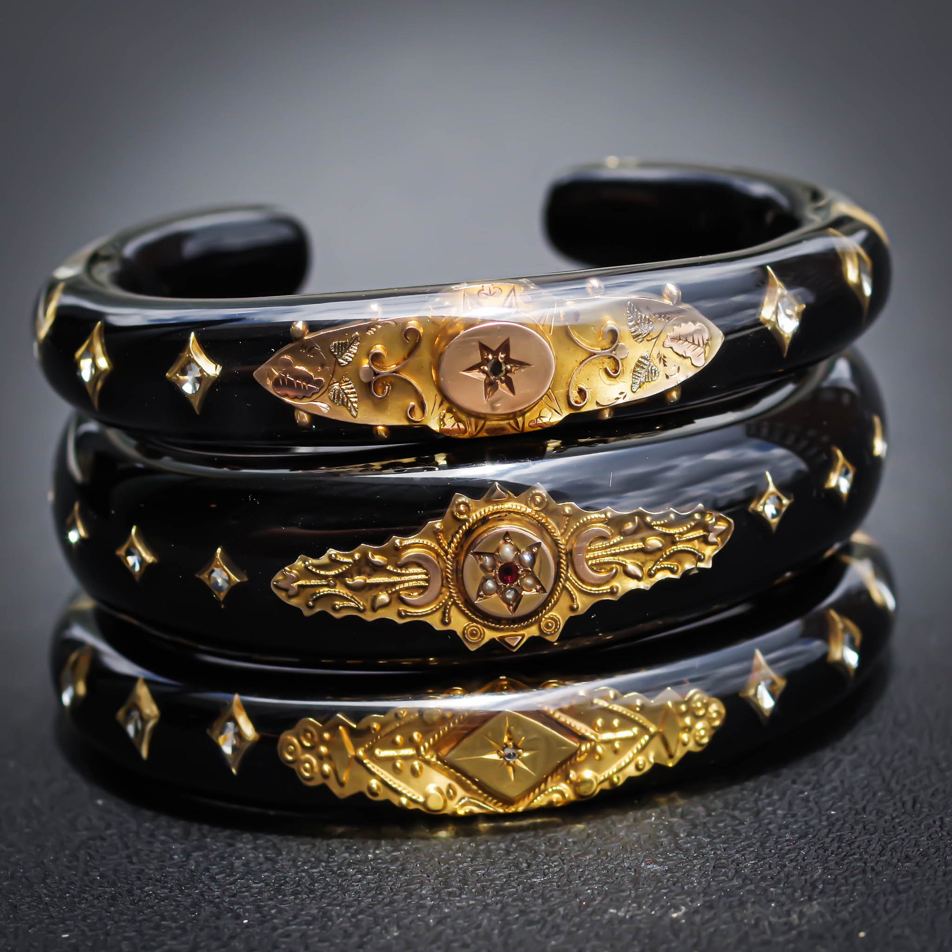 100年以上の時を経た18金ゴールドのイギリスのアンティークブローチを、ブラックバングルの中に封じ込めたシリーズ。