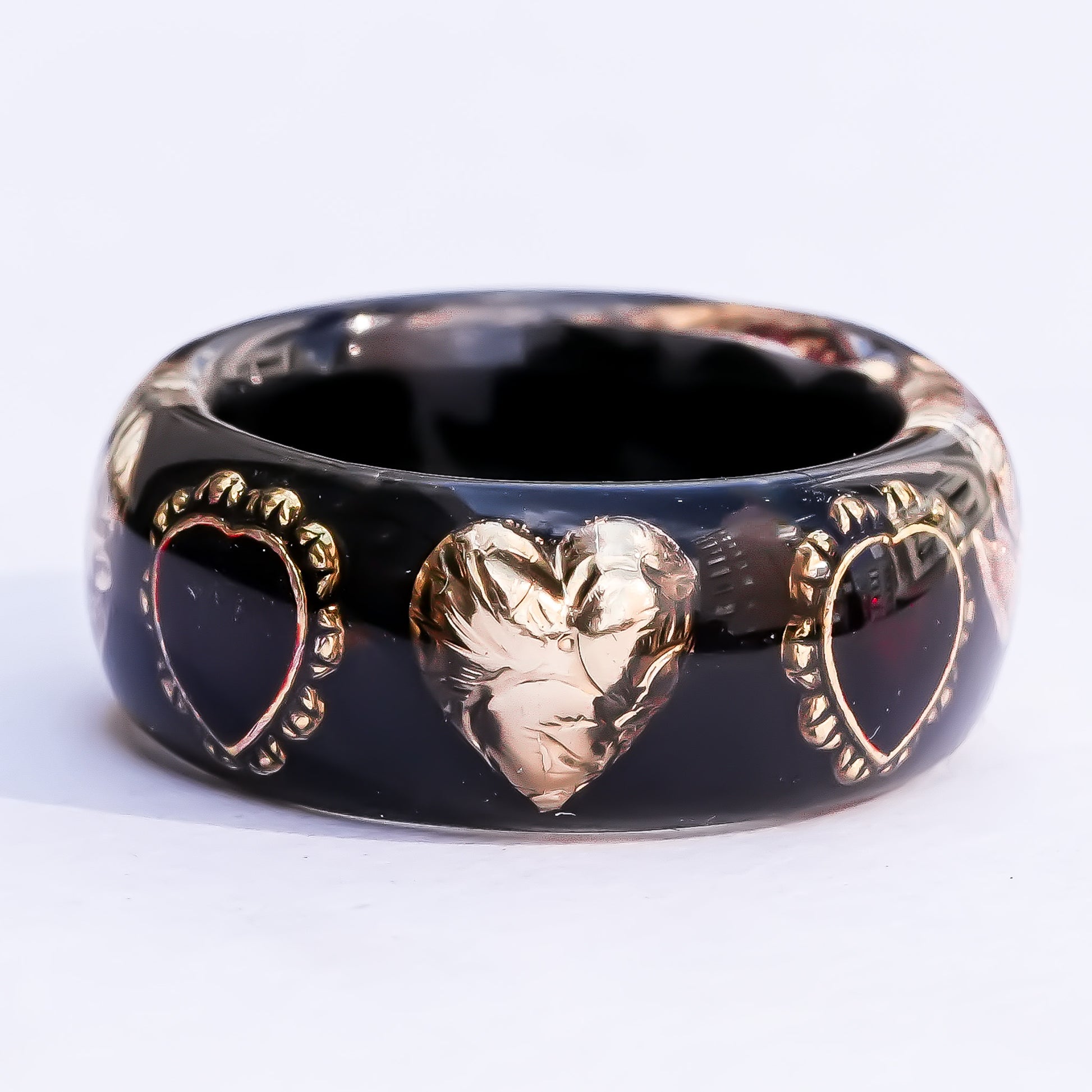 リング全体を囲む赤とゴールドのハートが重厚感と高級感を引き立てます。