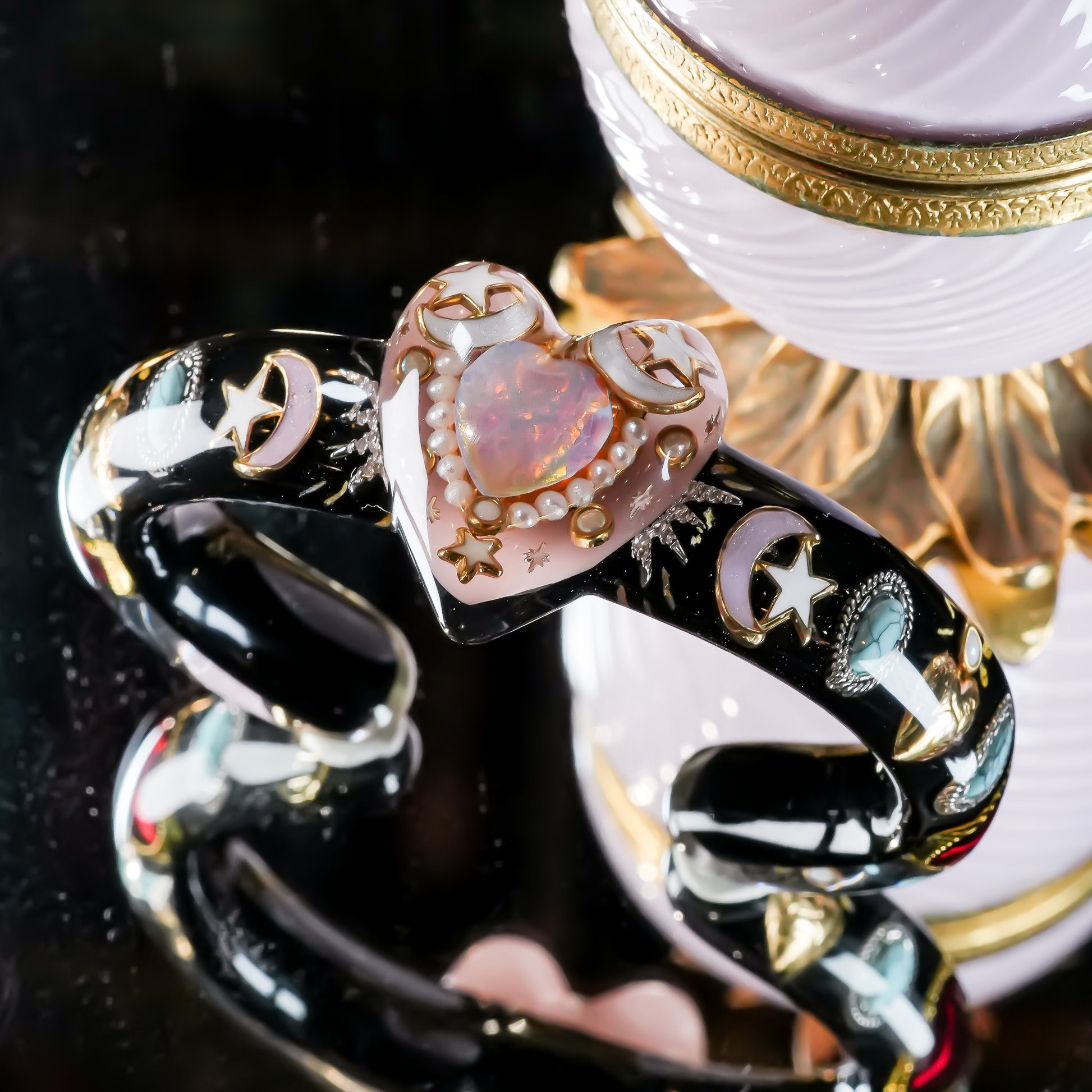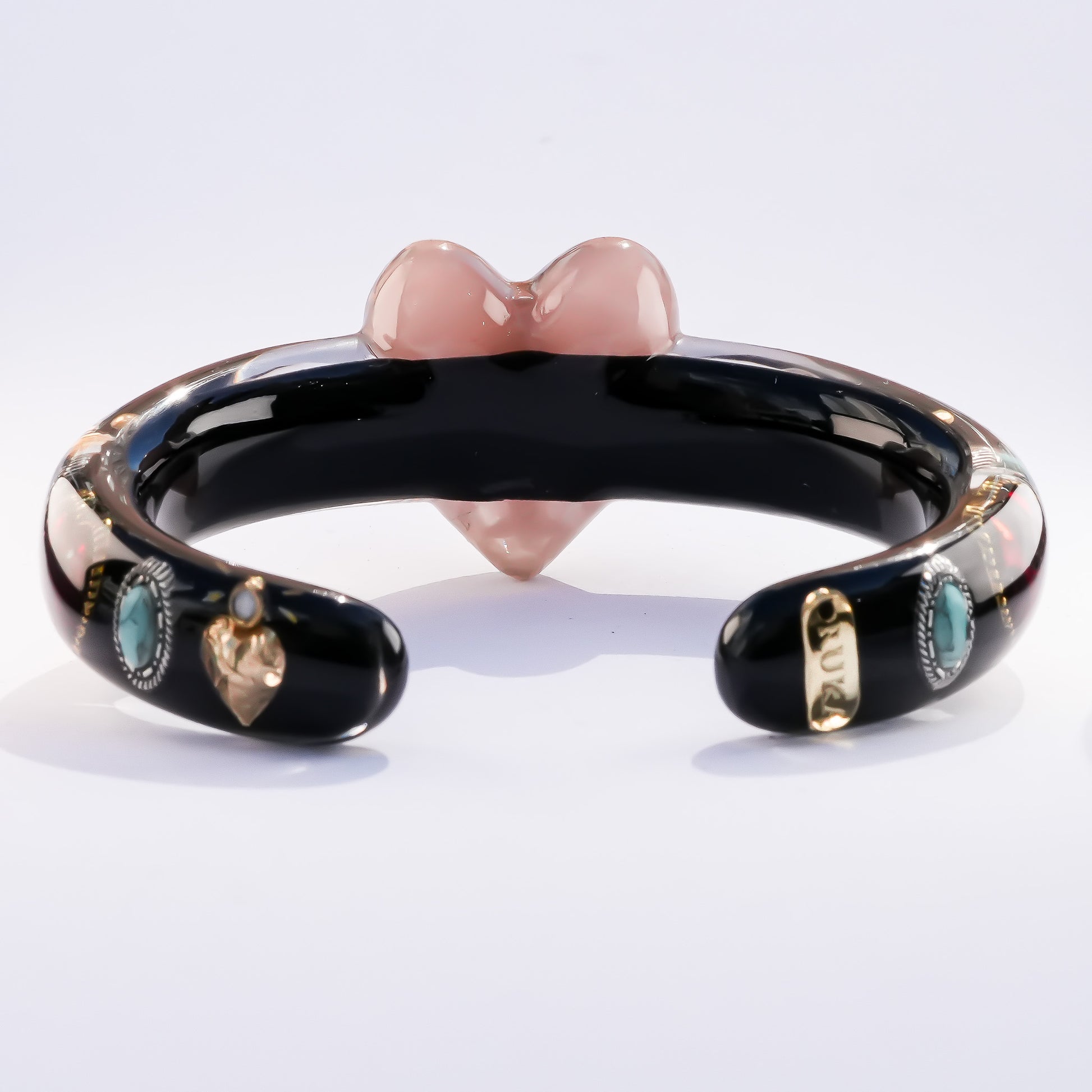 深みのあるブラックベースに、スモーキーピンクのハートが輝く幻想的なバングル。