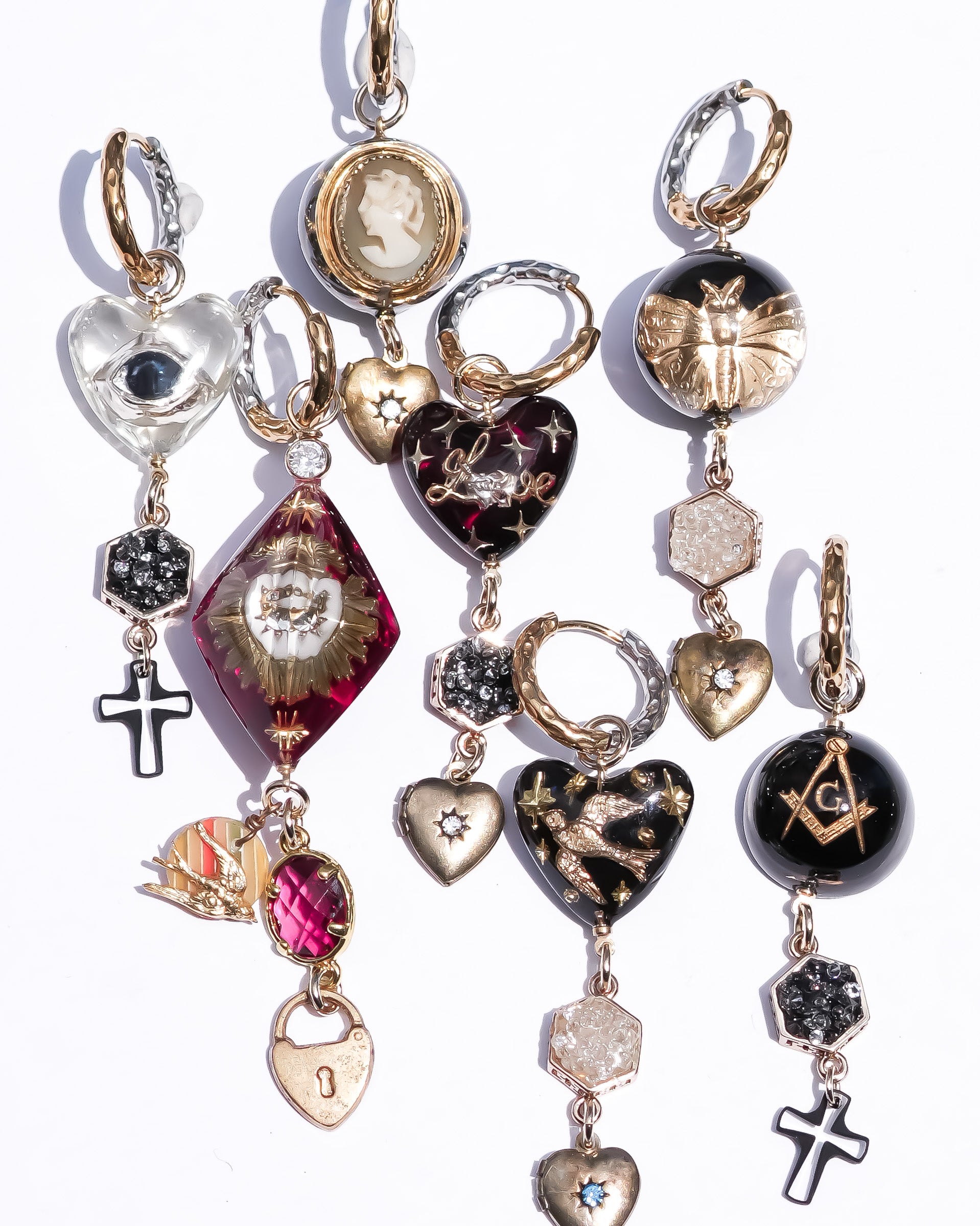 こちらはドーム型の中にヴィンテージのフリーメイソンのガラスチャームが入ったピアスです。