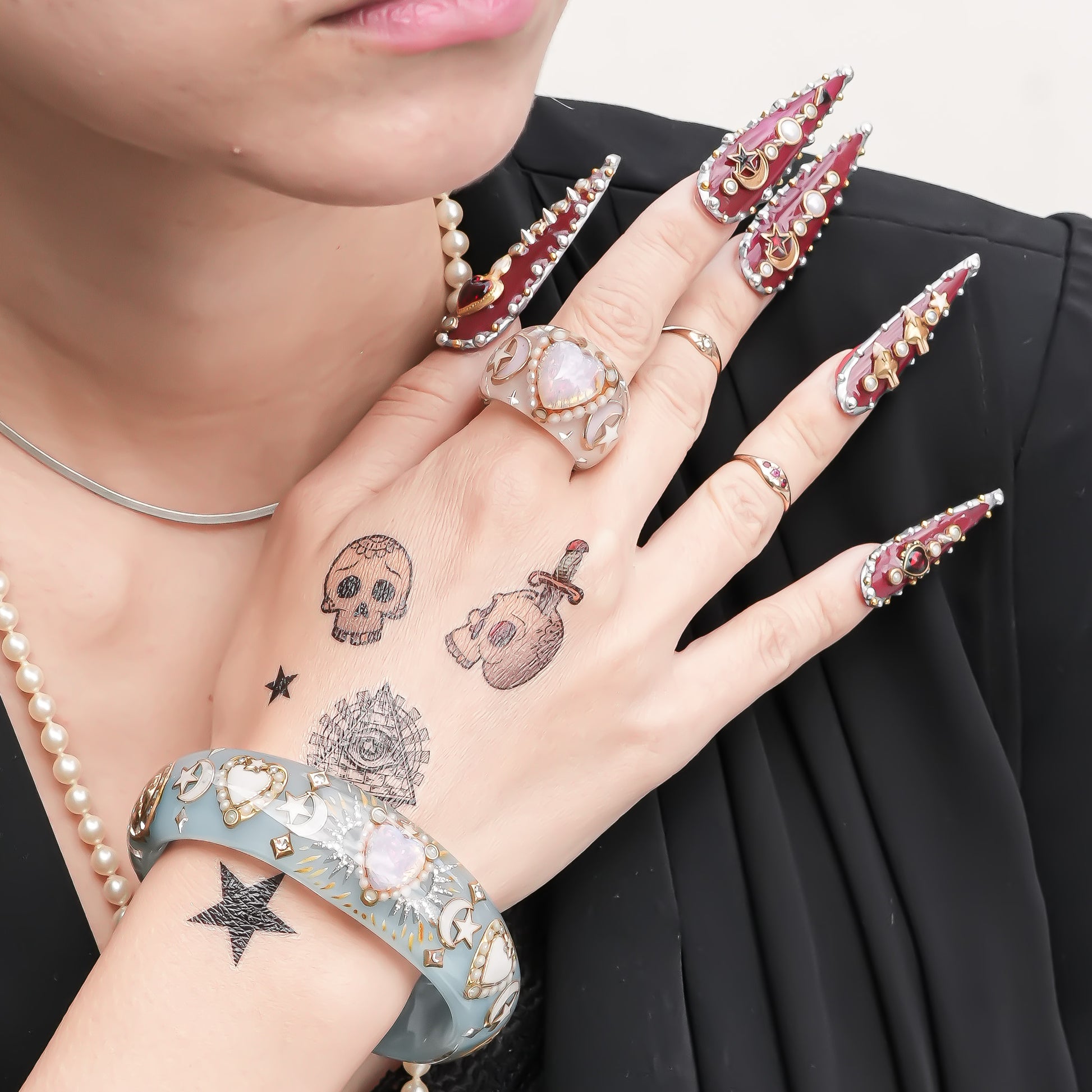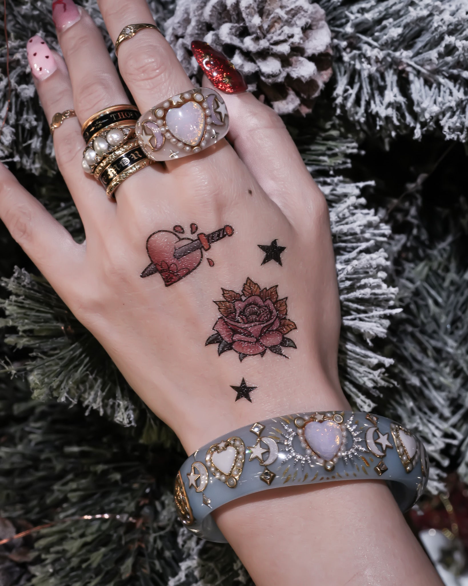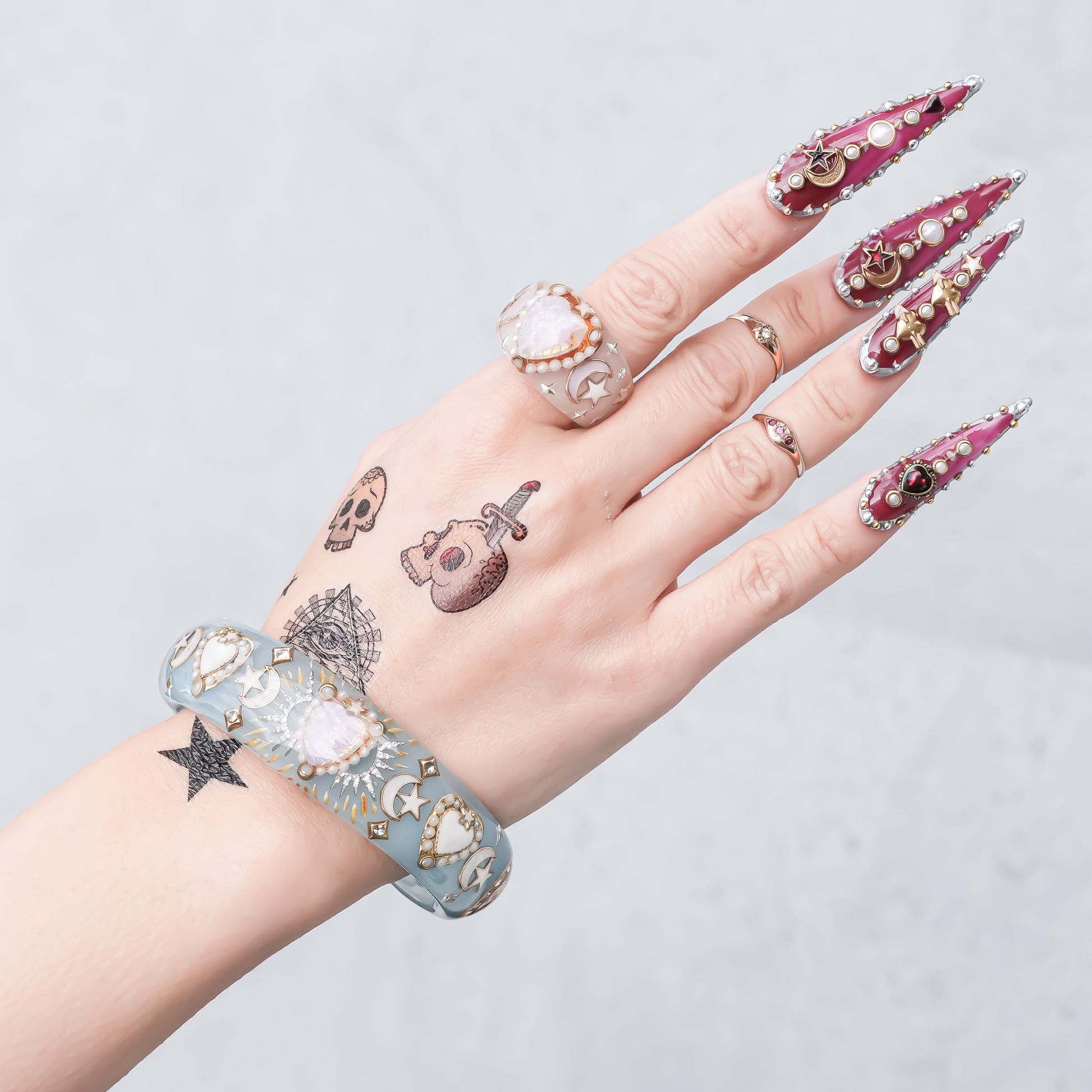 その周囲には星や月、ハートのモチーフが散りばめられています。