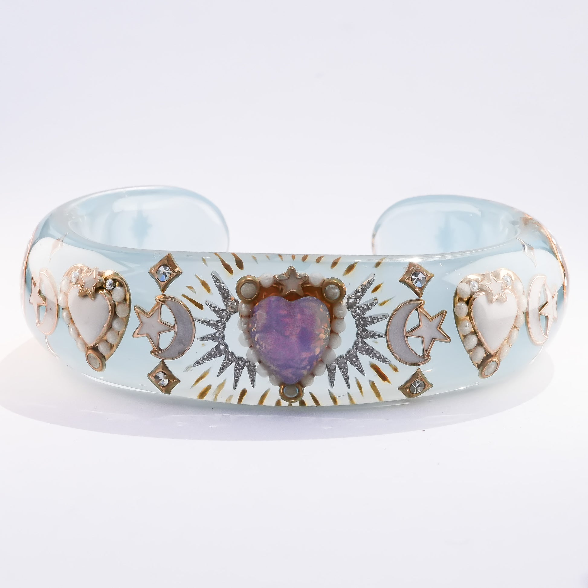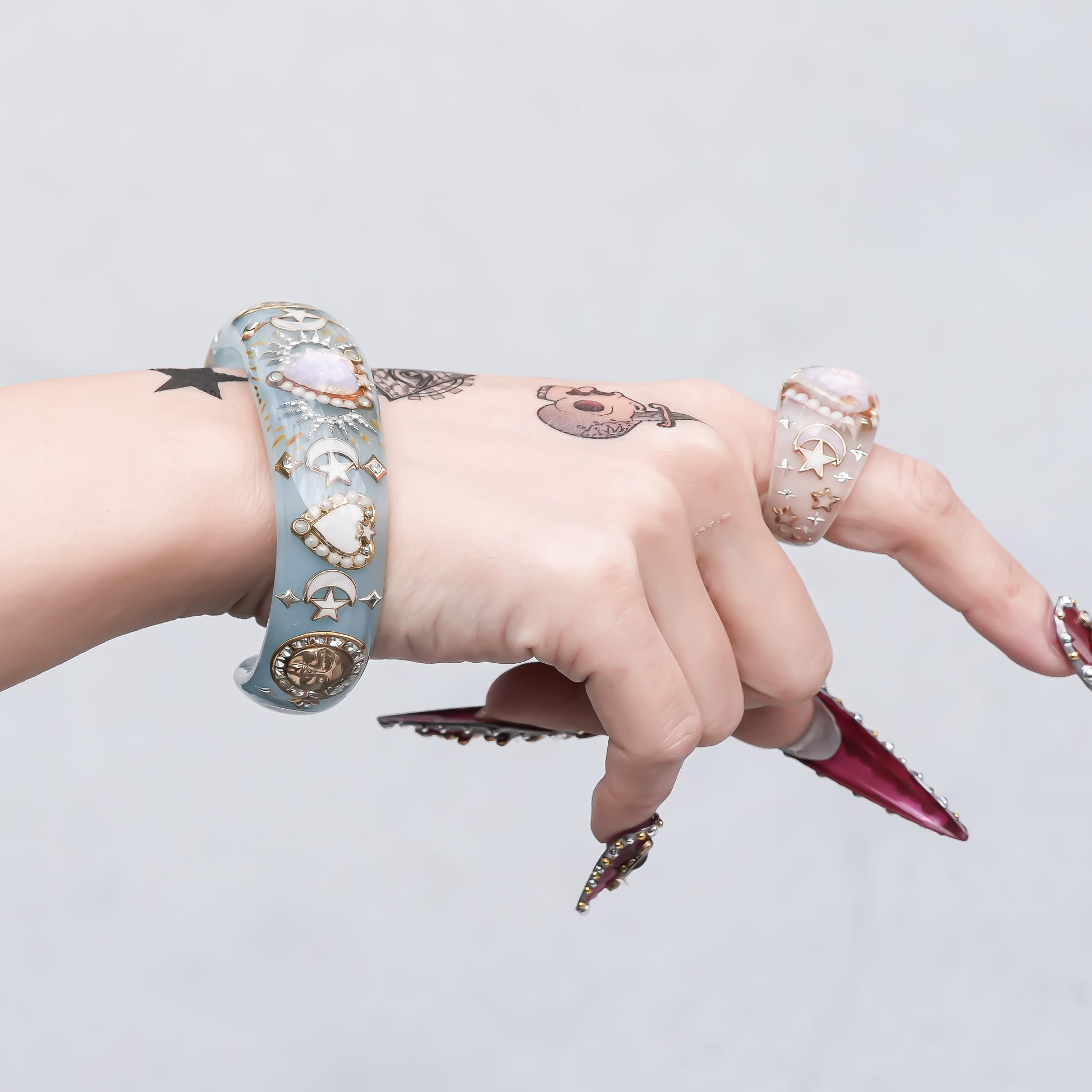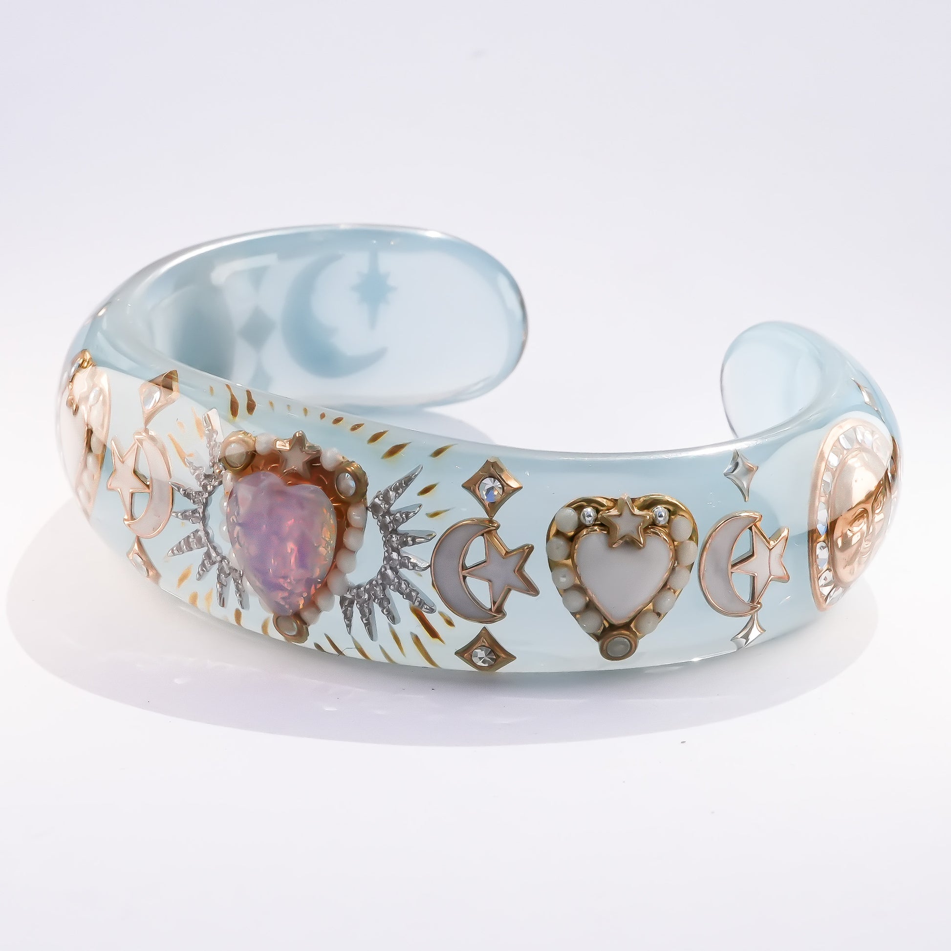 淡いミルキーブルーの中に、ピンクオパールの光が静かに揺らめく幻想的なバングル。