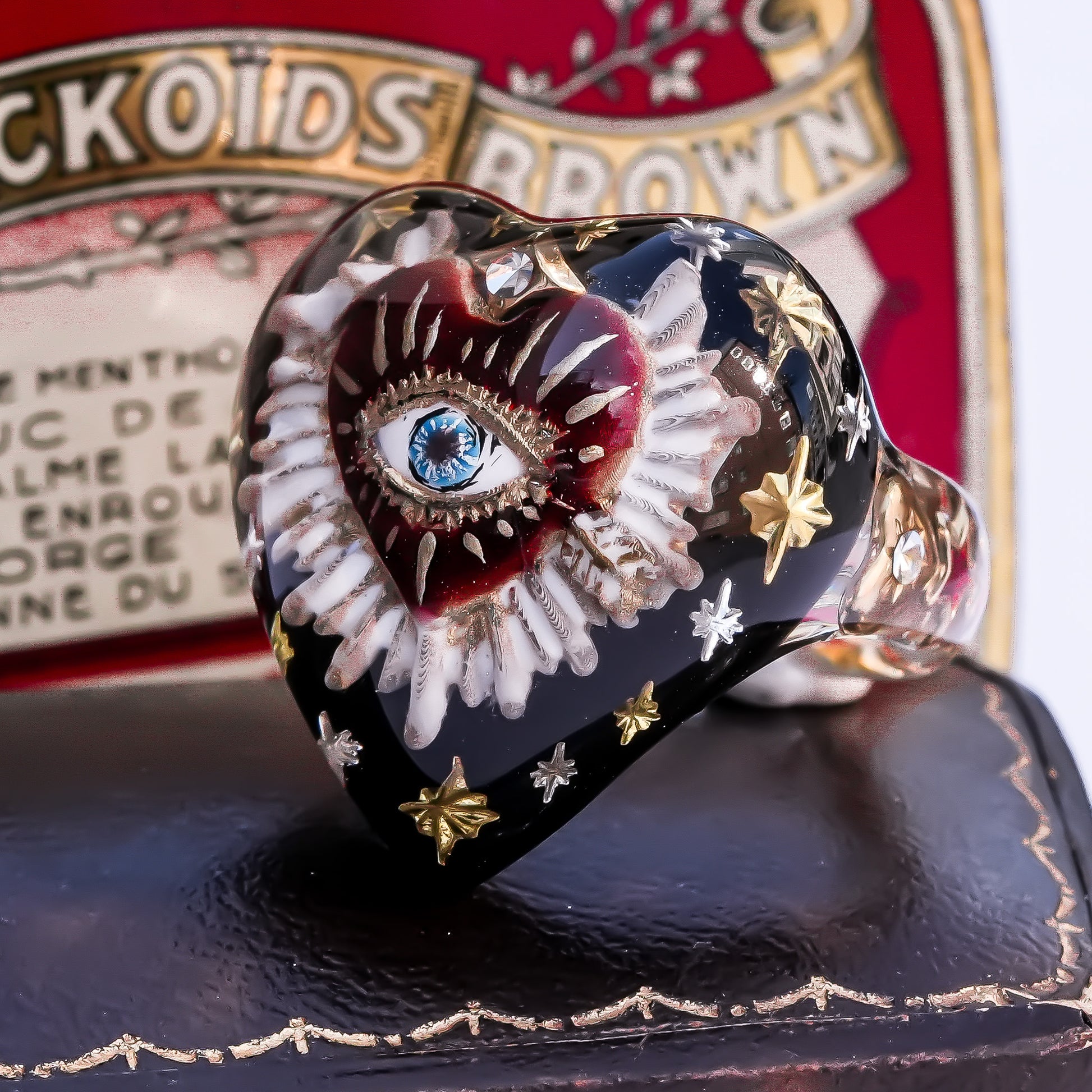 その中に赤いハートと“目”のモチーフを重ねた象徴的なデザインです。