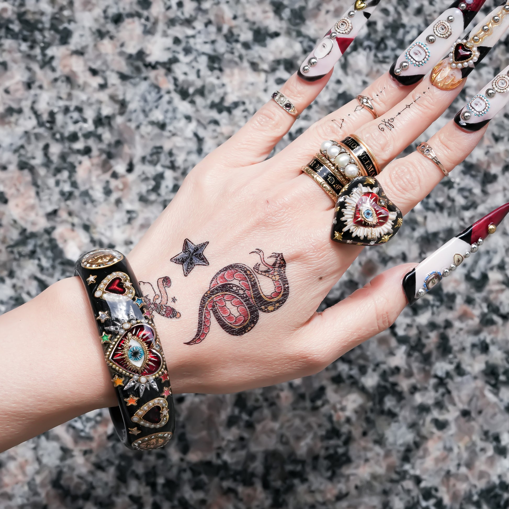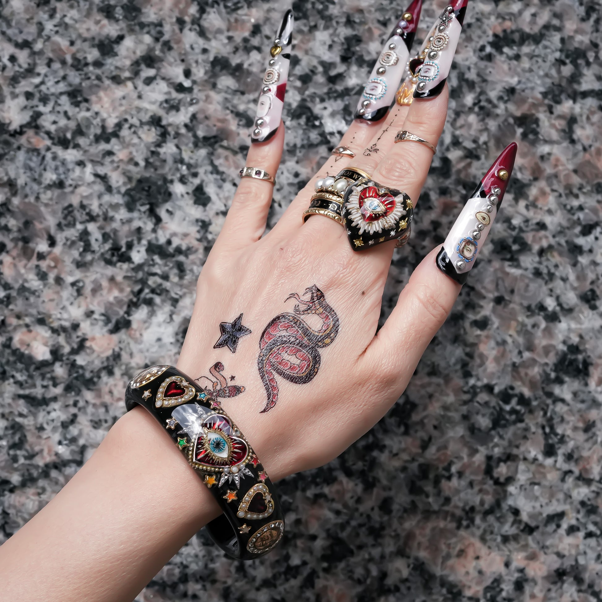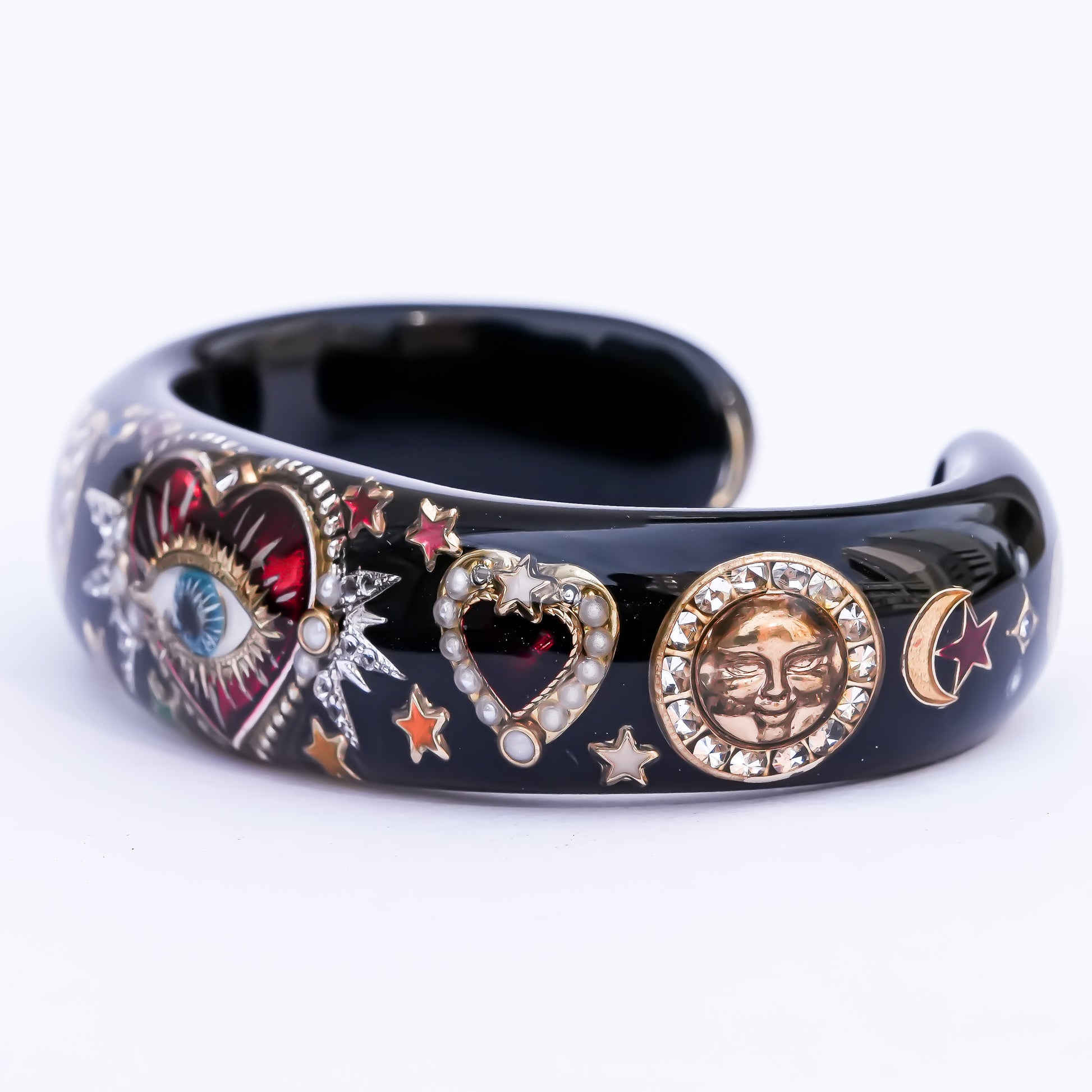 艶やかなブラックをベースに、真紅のハートと“目”のサインを宿した存在感あふれるバングル。