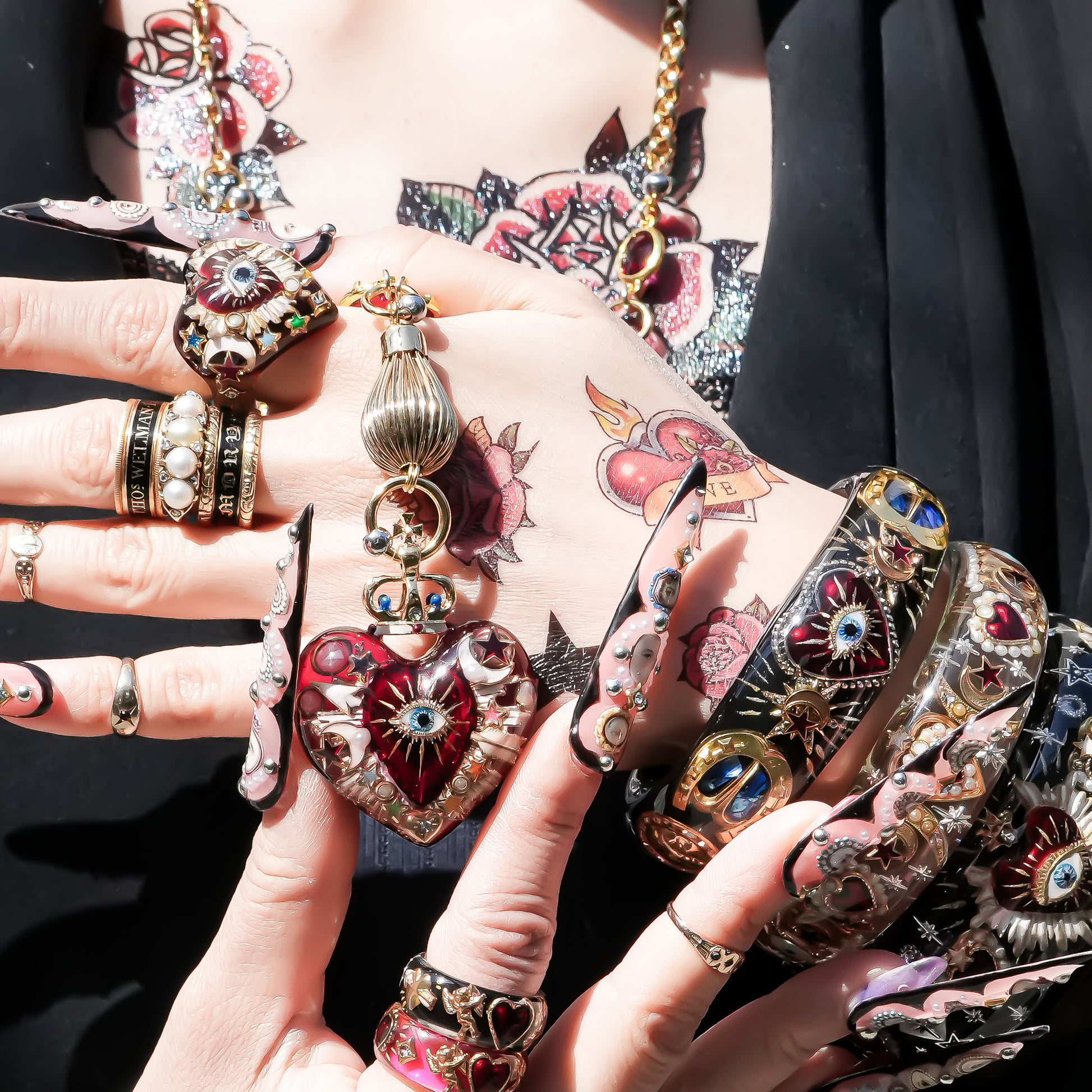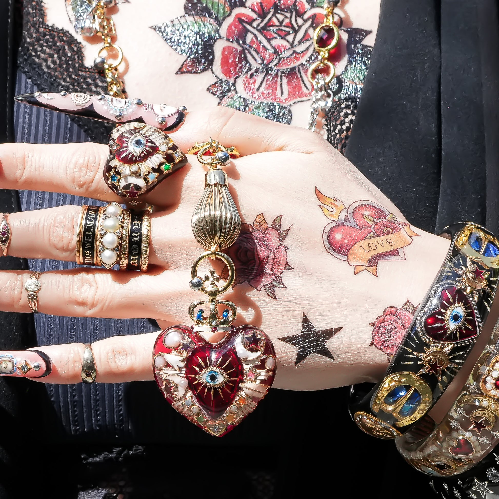 中央には燃えるようなレッドハートと“目”のモチーフ。