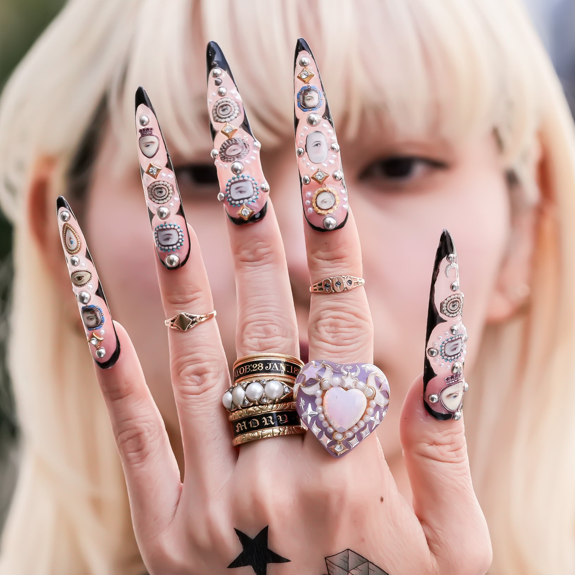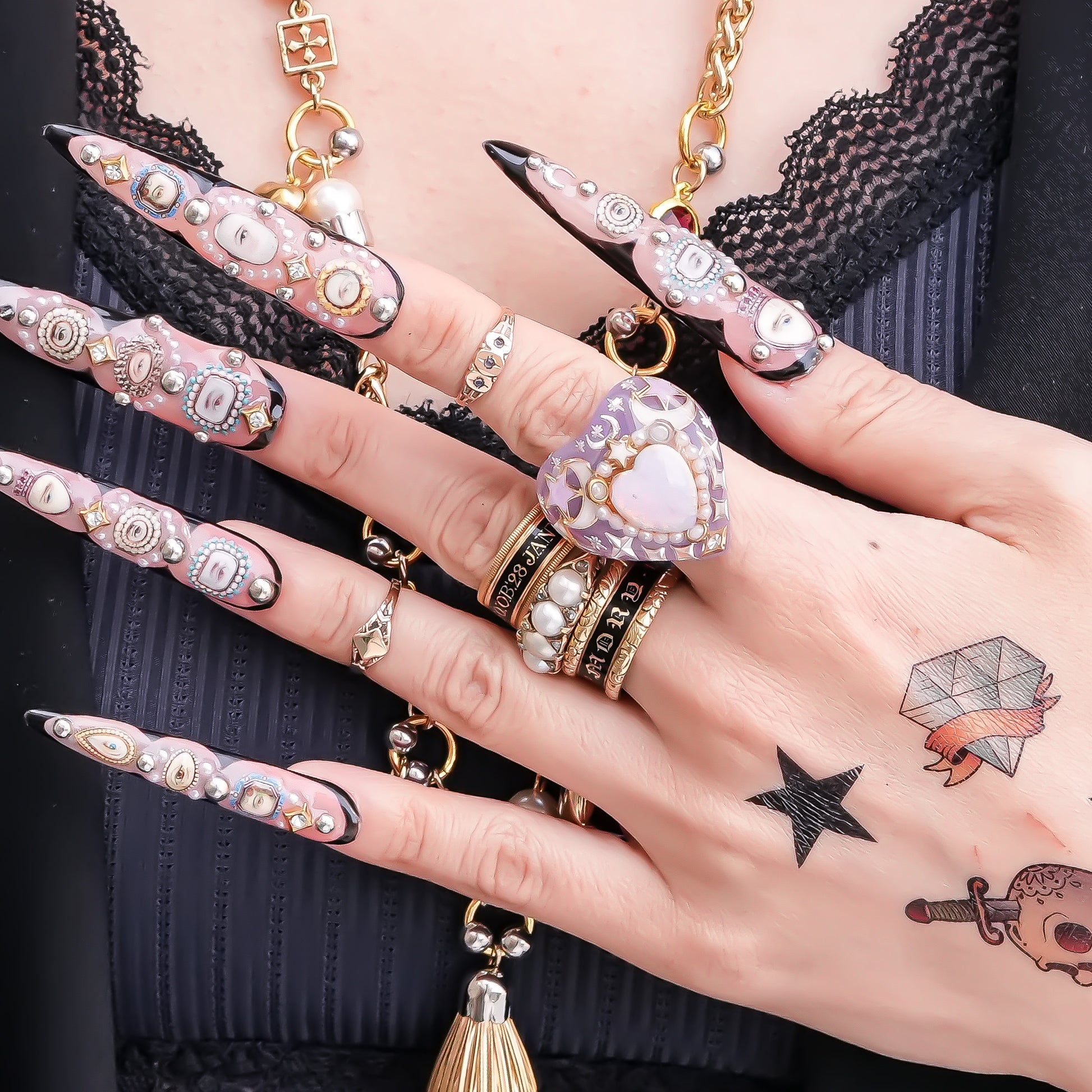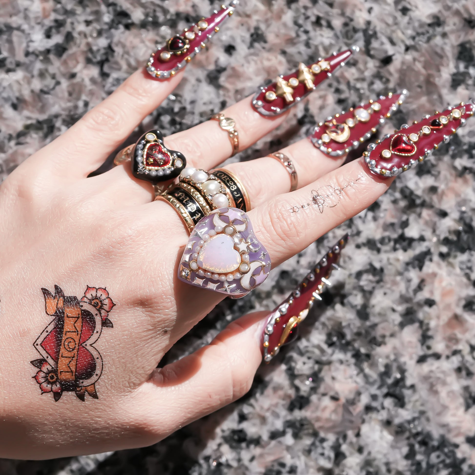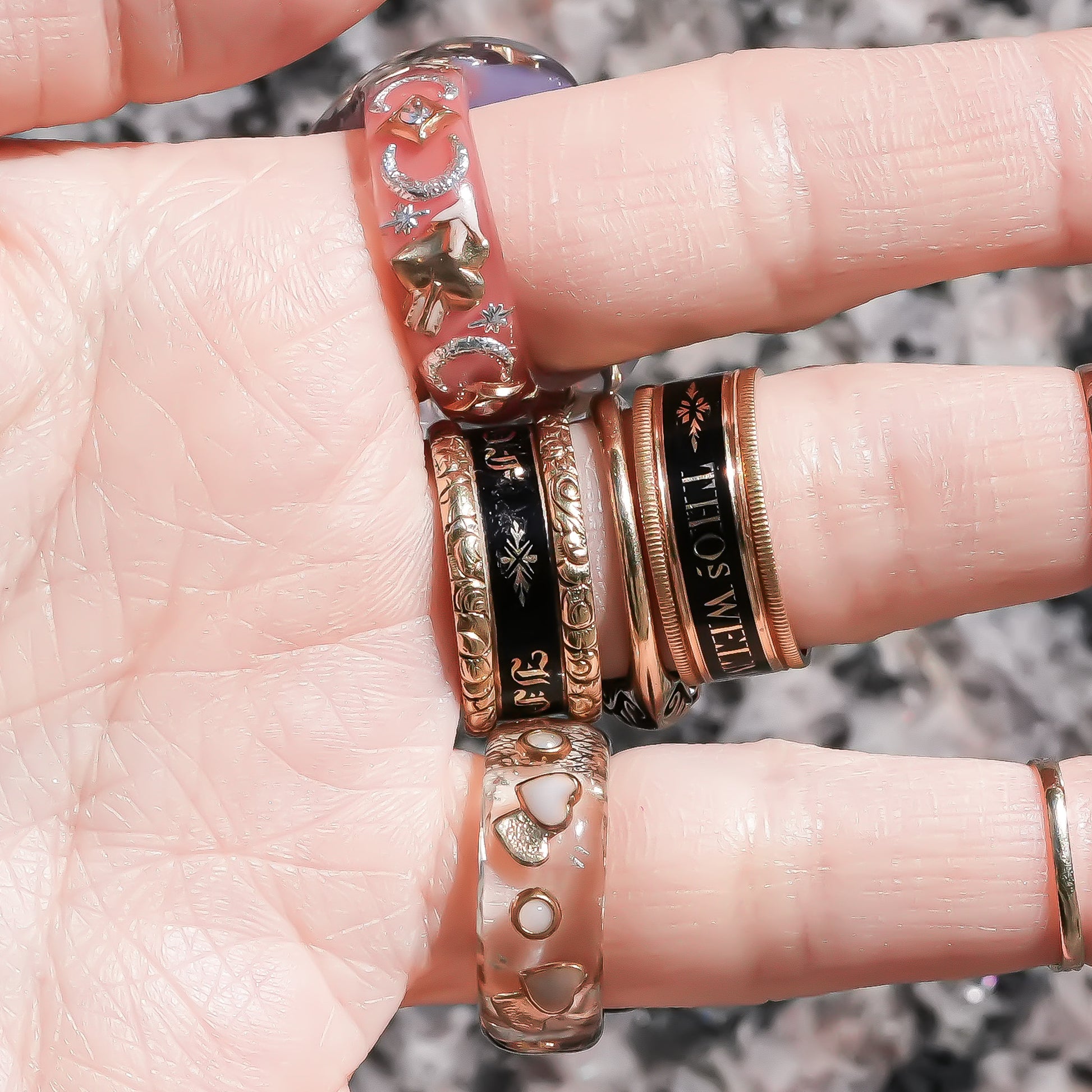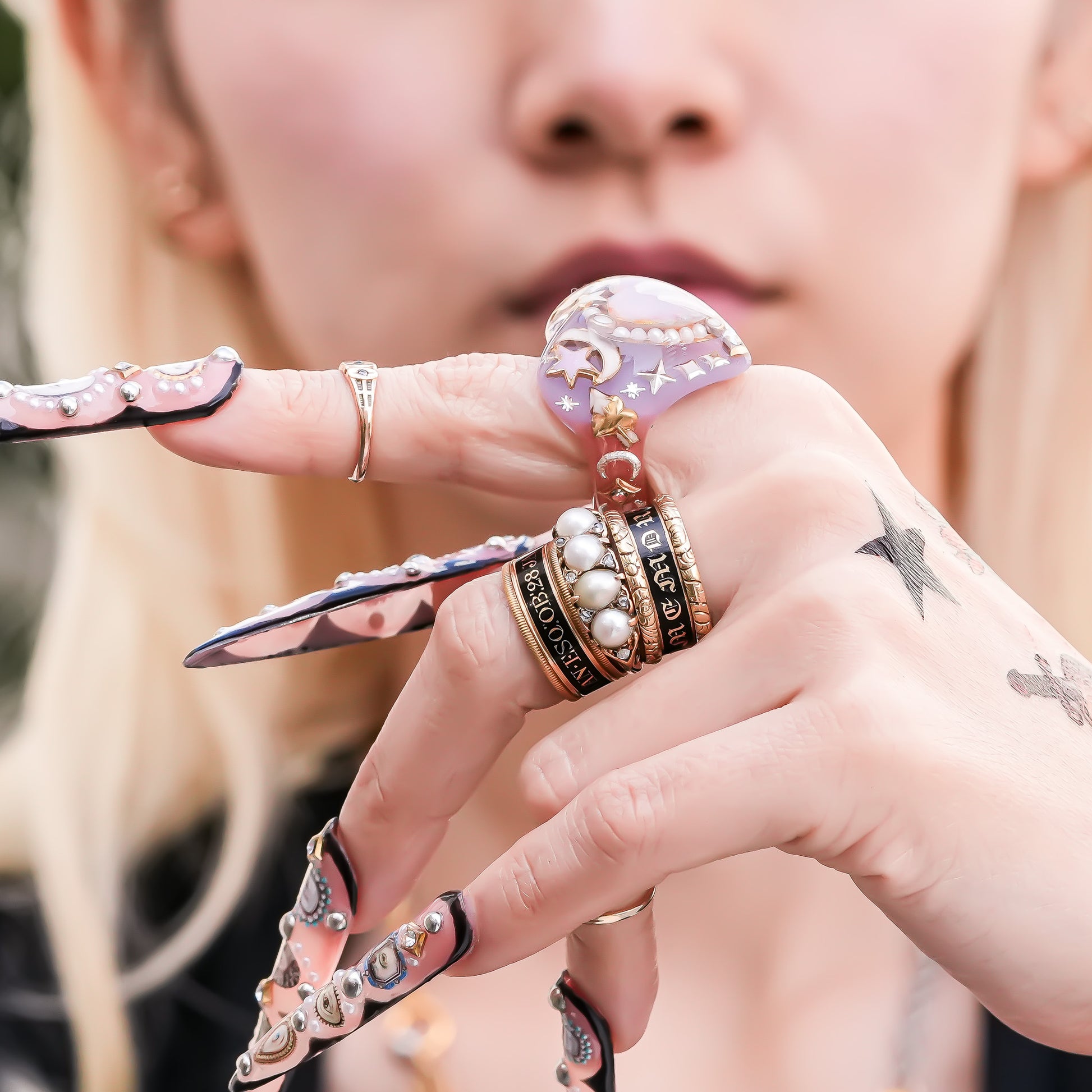 リング全体には星・月・五光・ヴィンテージチャームなどのモチーフを散りばめ、