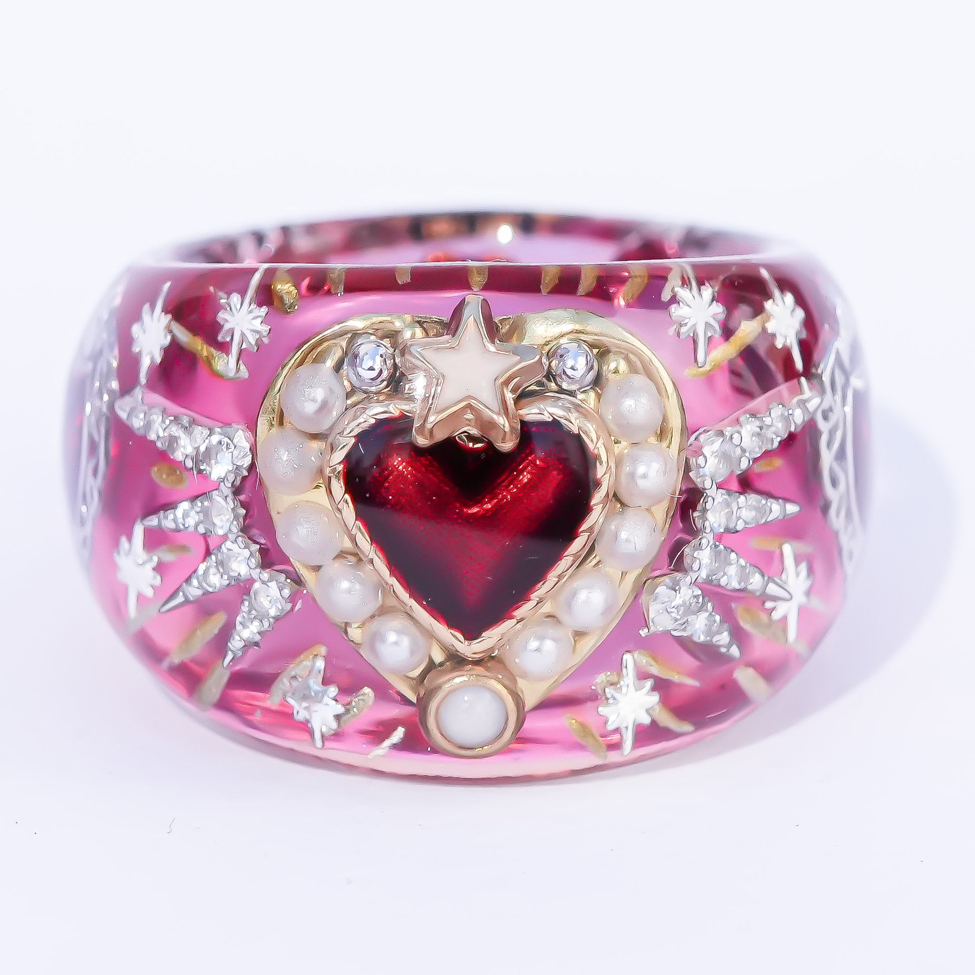 中央のハートは深紅の輝きを放ち、周囲の星たちがそれを祝福するように輝きます。