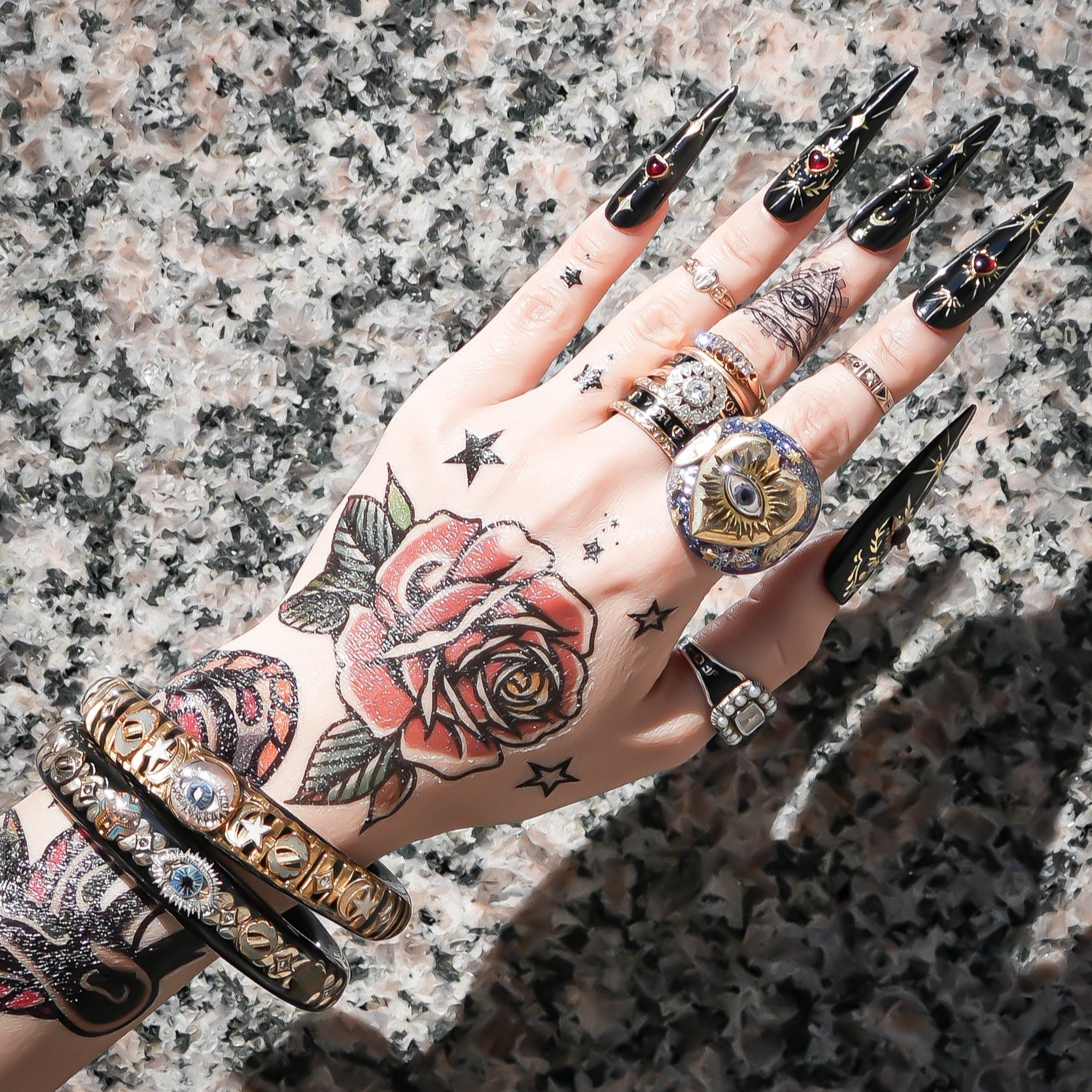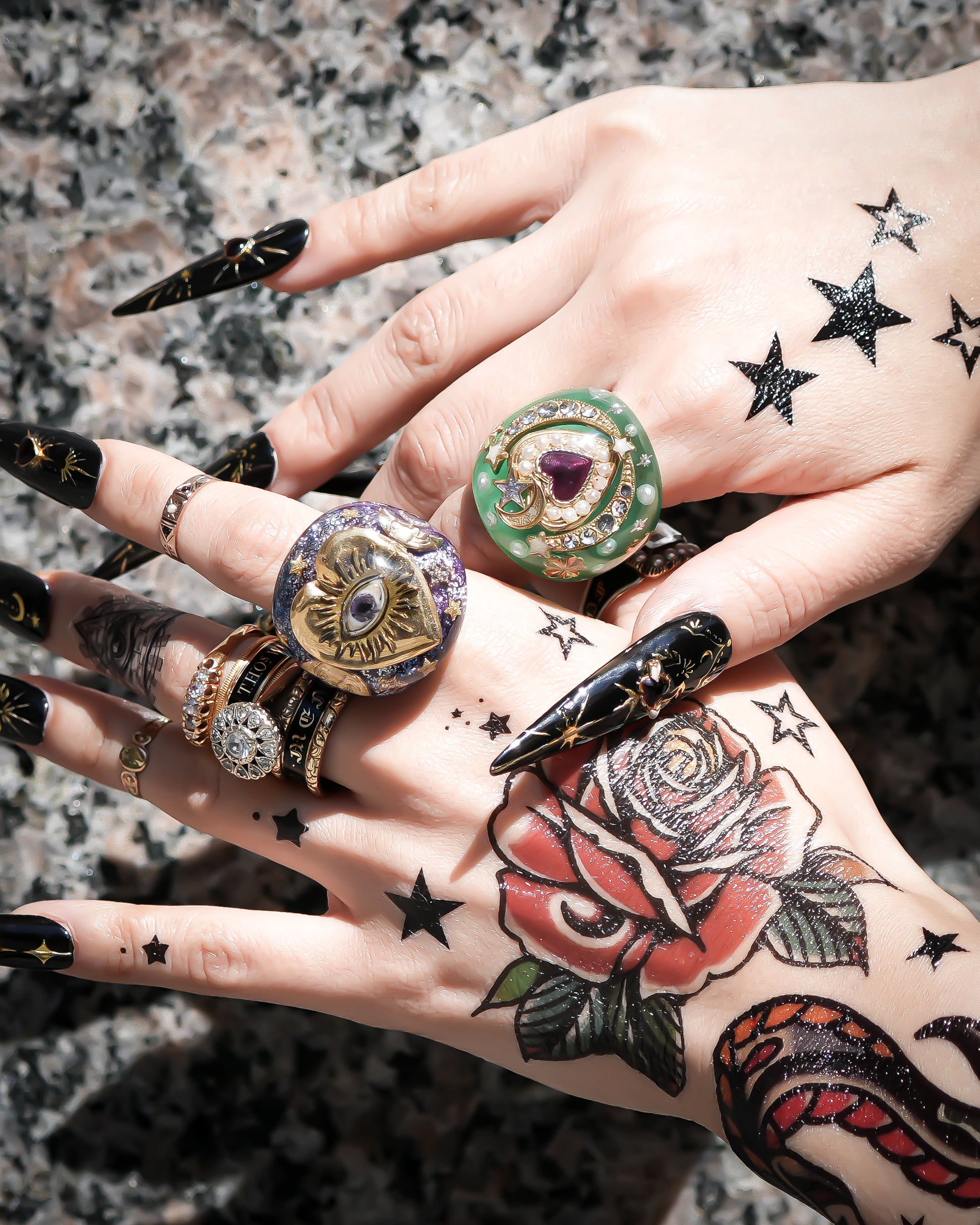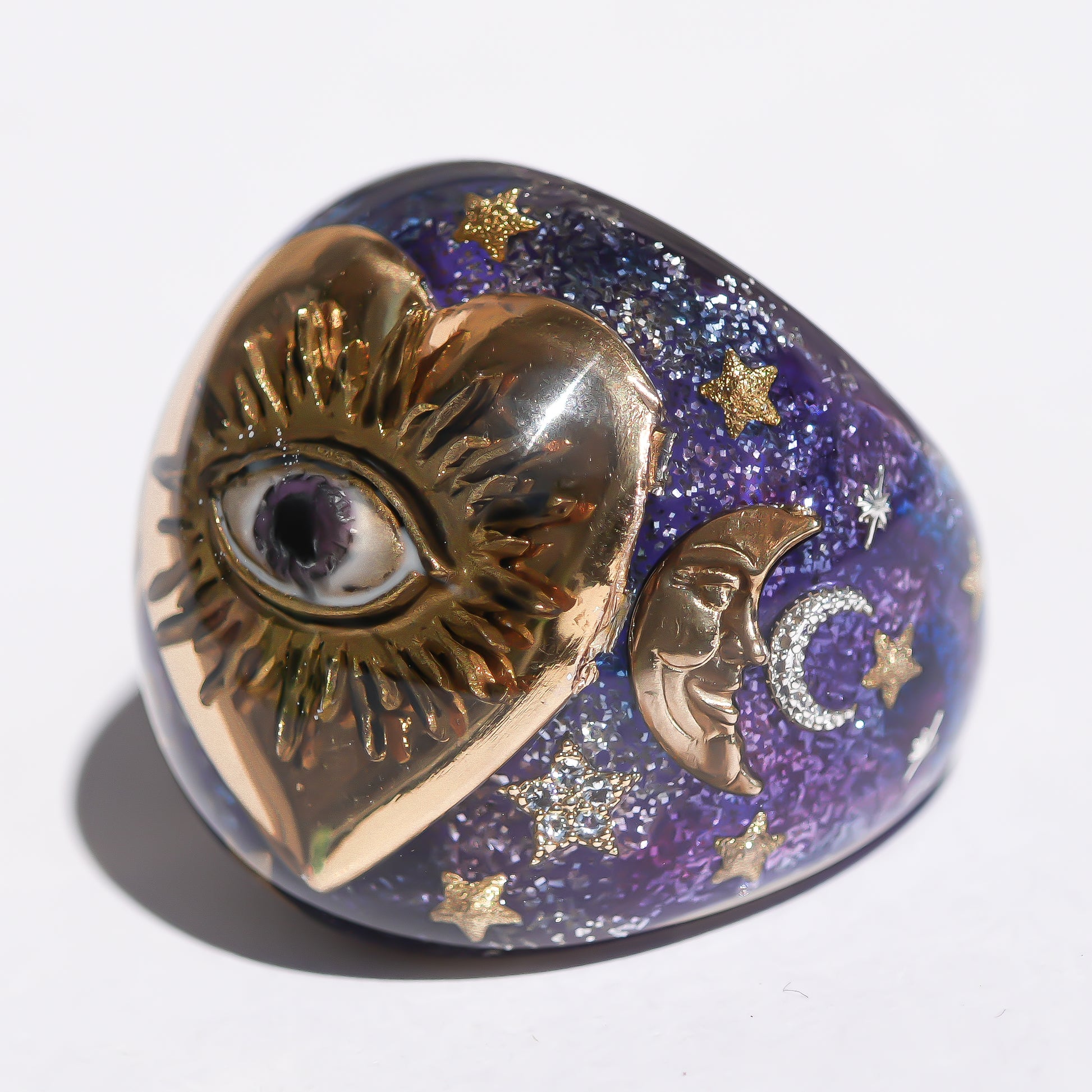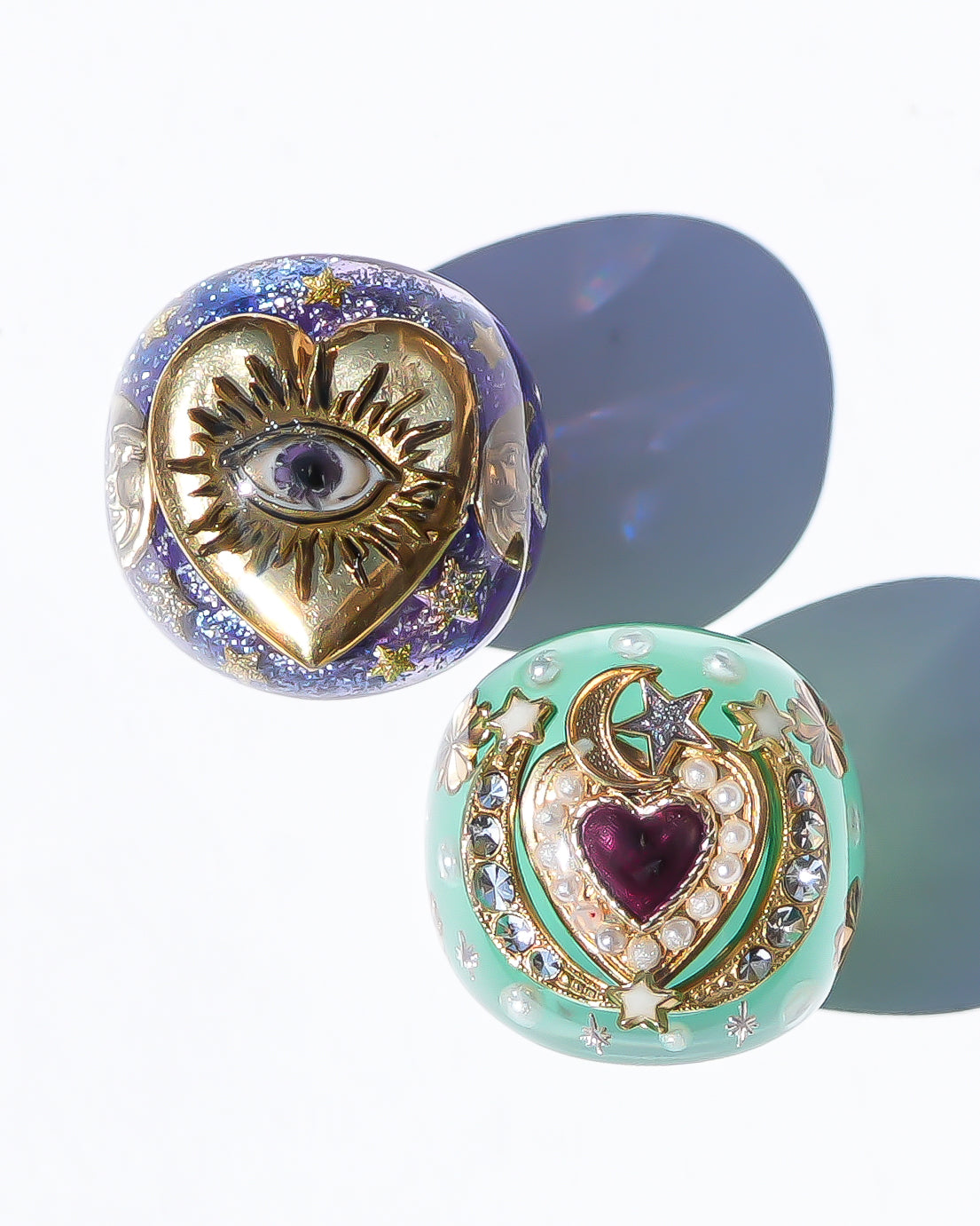 アメリカで買い付けてきたアンティークのハートチャームに、RUKAのオリジナルEYEモチーフをデザインしたリングです。