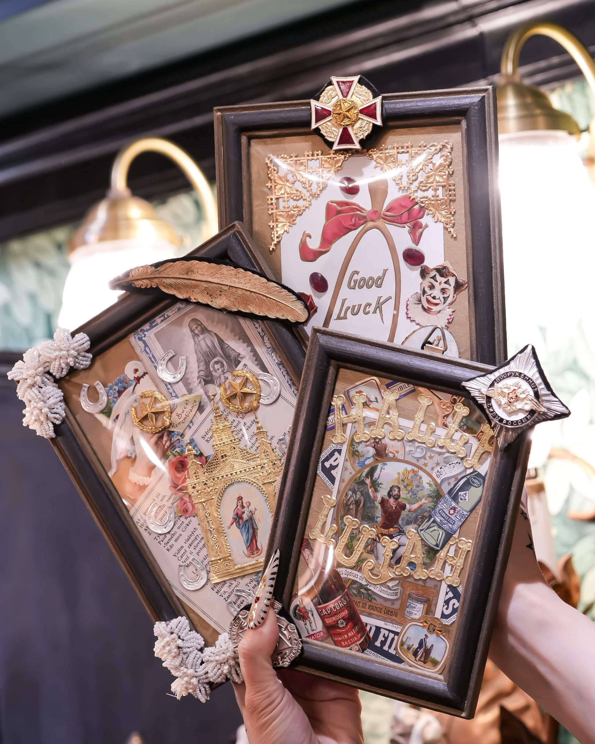 フランスで買い付けて来たアンティークペーパーなどをコラージュし、デザインした1点物の壁飾りです。