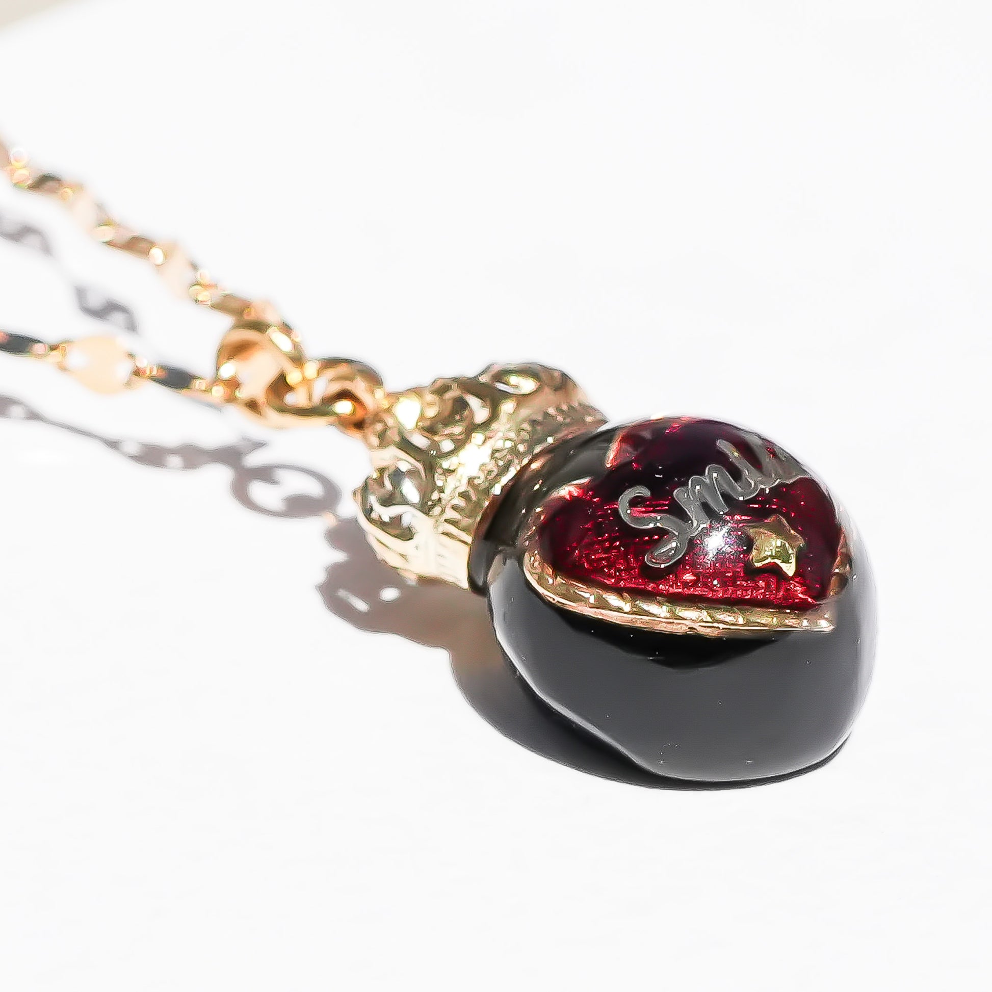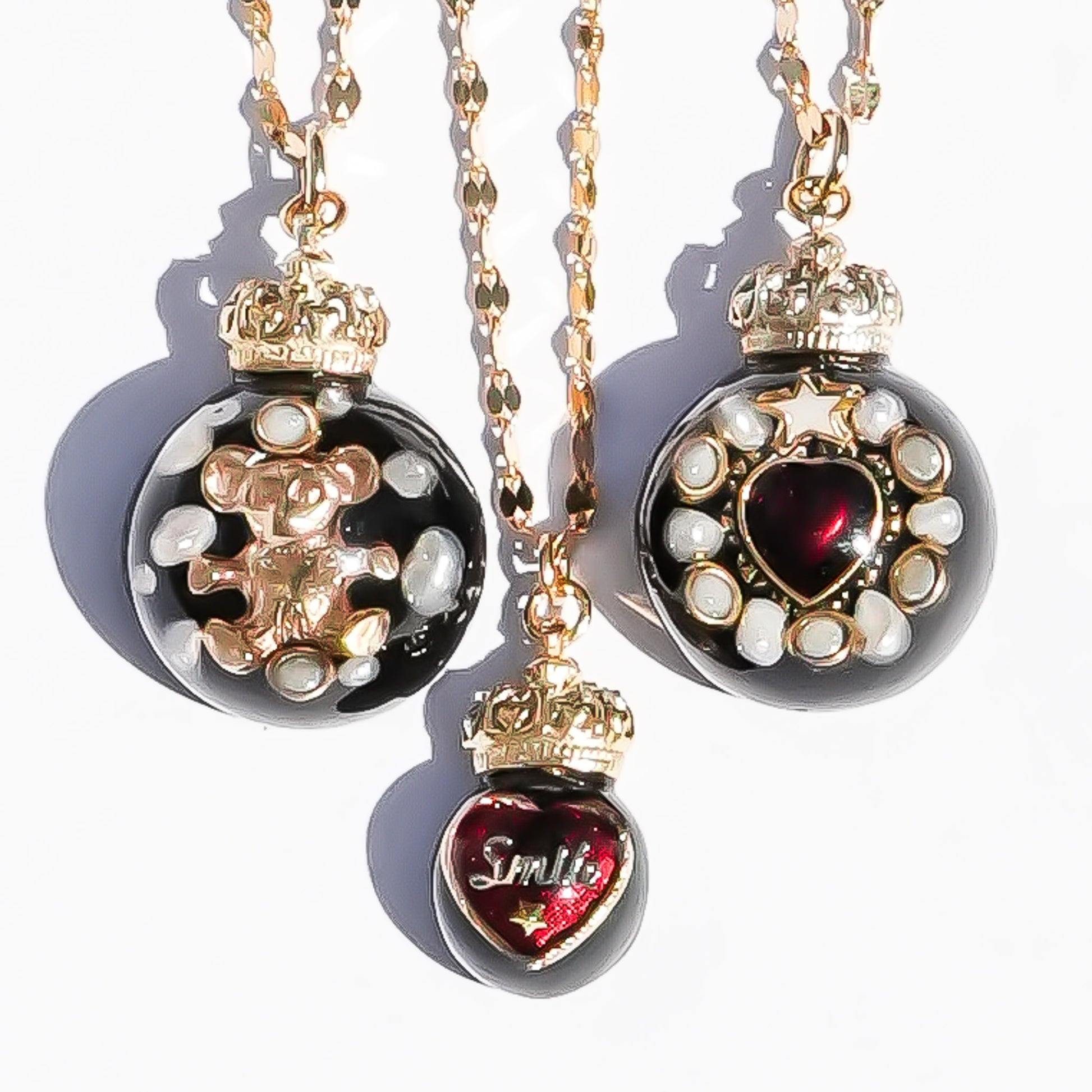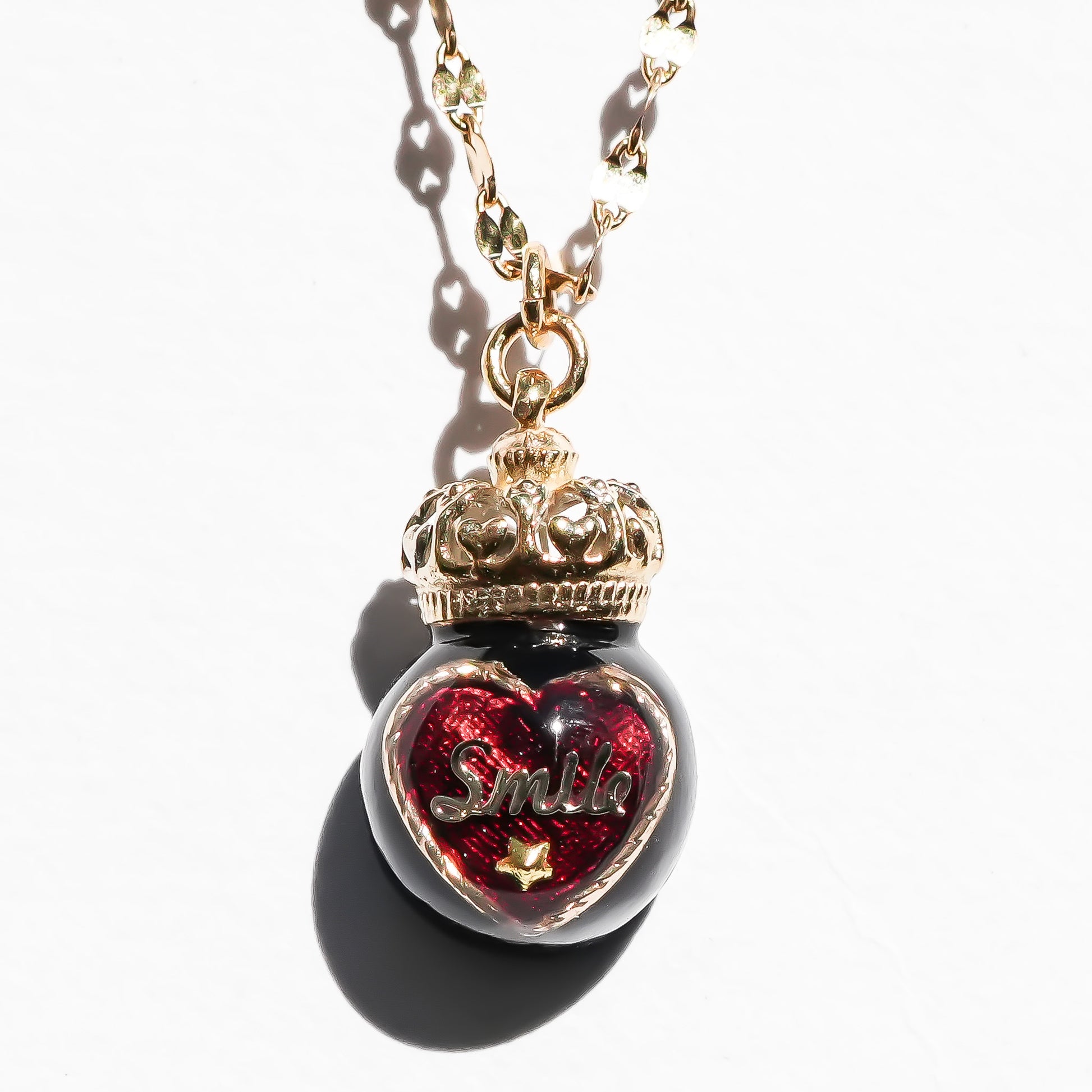 小さな黒いオーナメントの中には、赤く輝くハート、そしてその中央にはやさしく微笑む「Smile」のメッセージが。