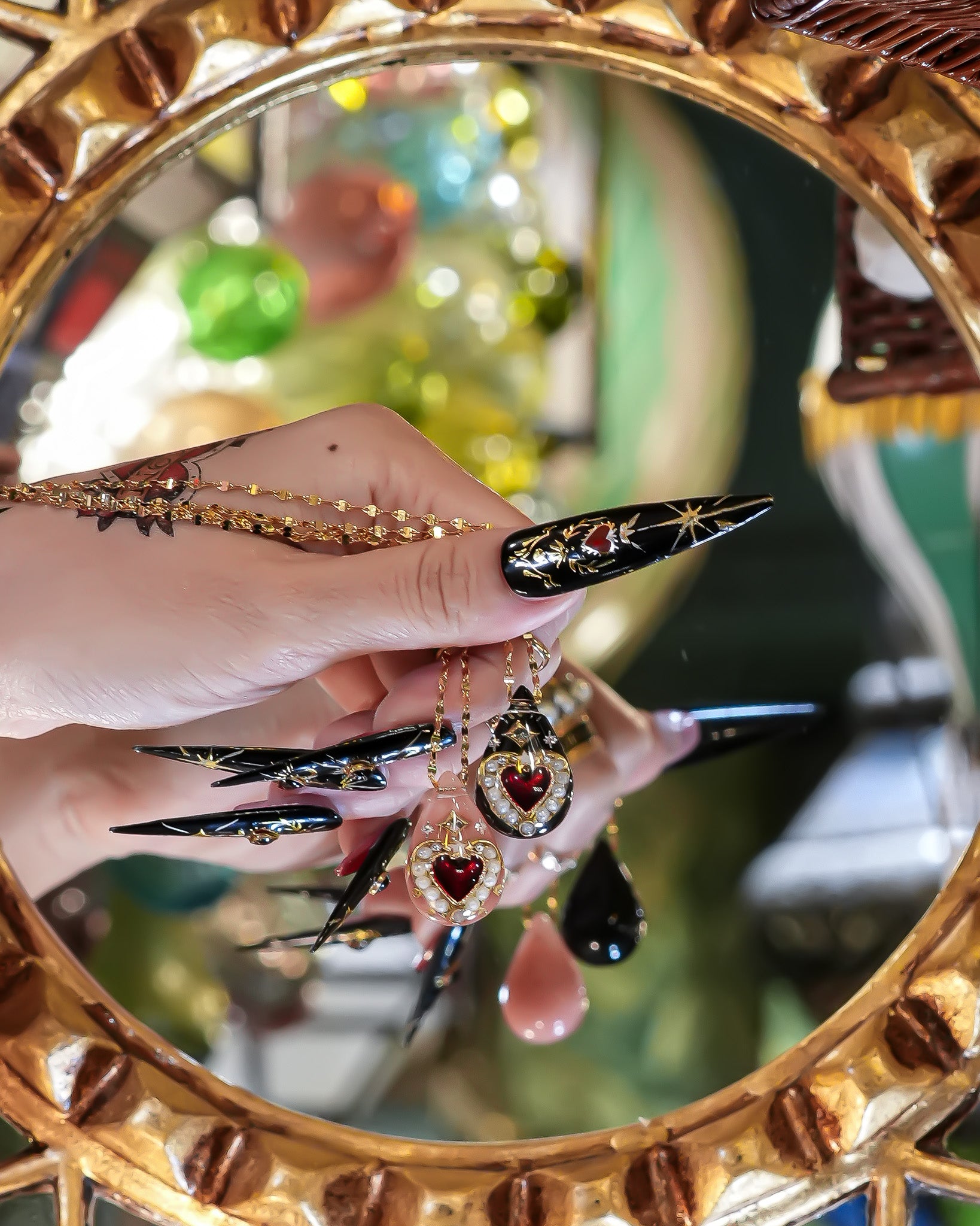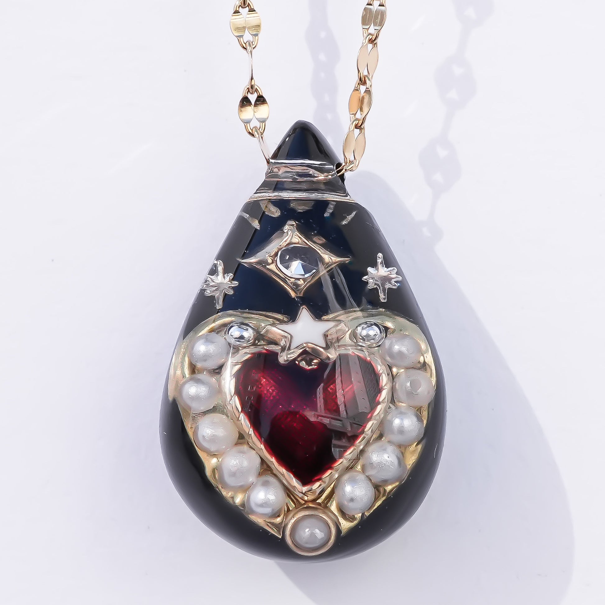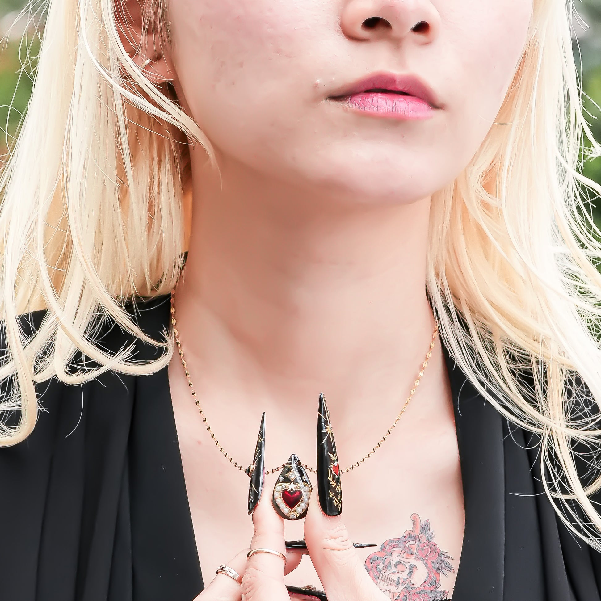 ひとしずくの涙が、夜空の中でハートの光に変わったような“Crimson Drop Necklace”。
