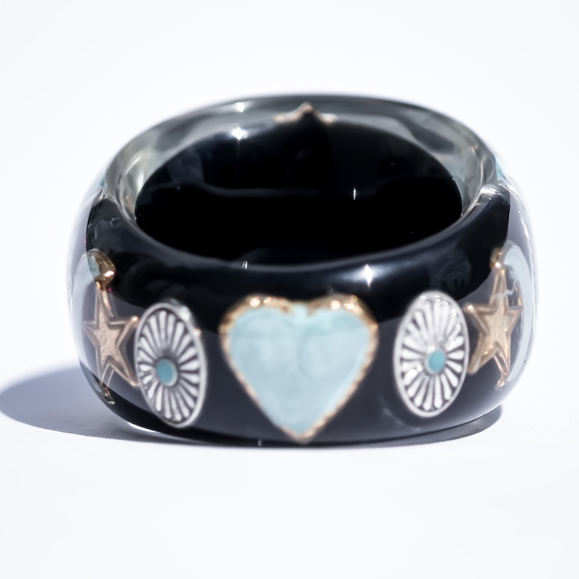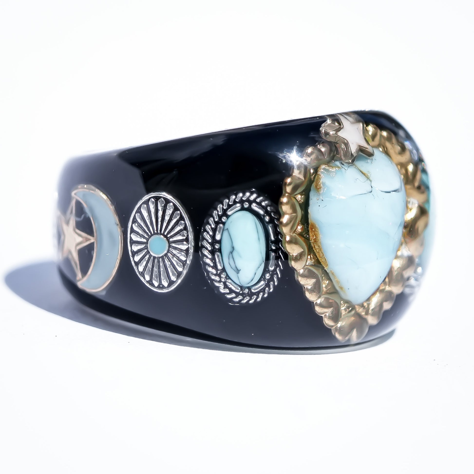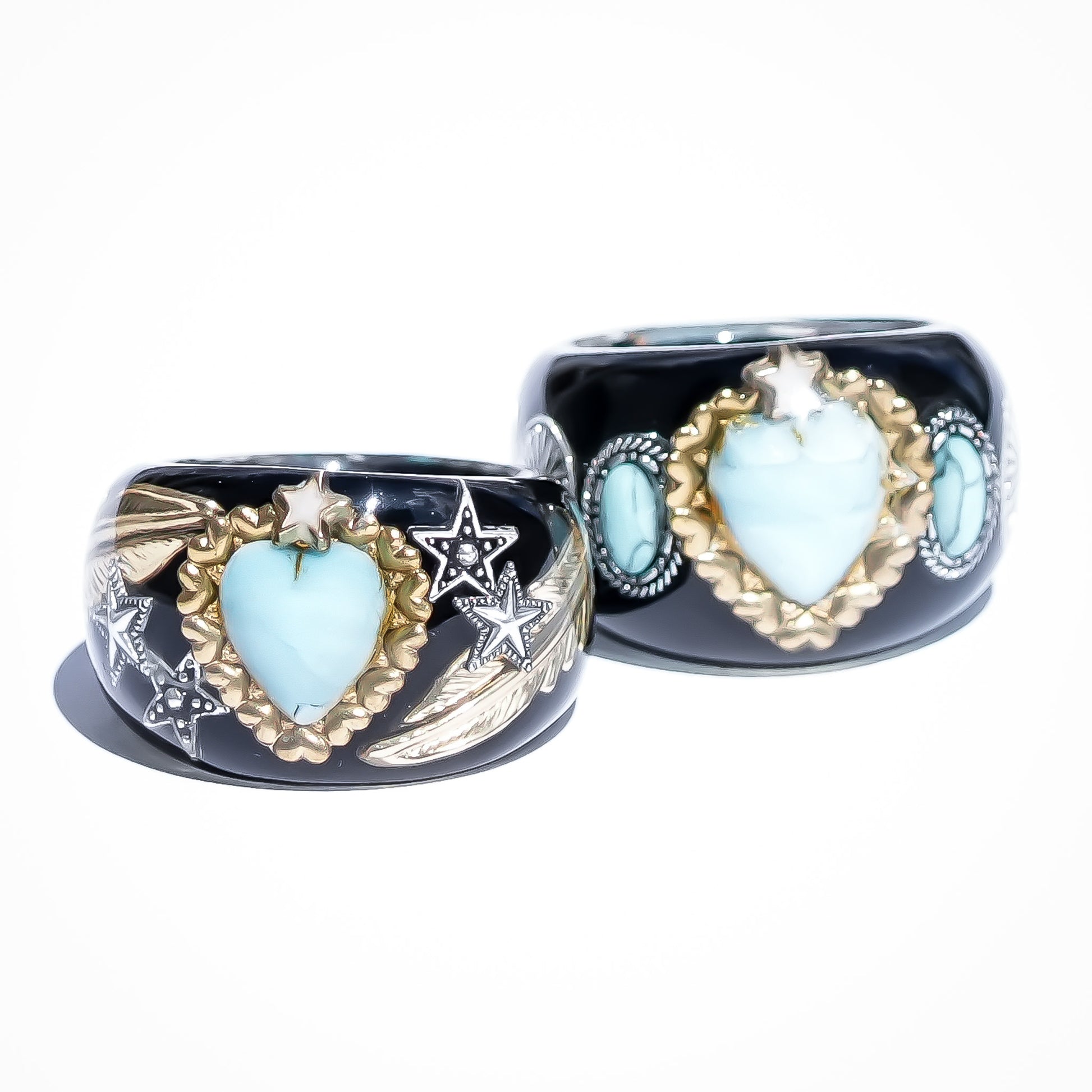ハートモチーフでありながら、ブラックベースに月・星・サンバースト・ターコイズなどをちりばめ、甘さを抑えた“クールで力強い美しさ”を表現したシリーズです。