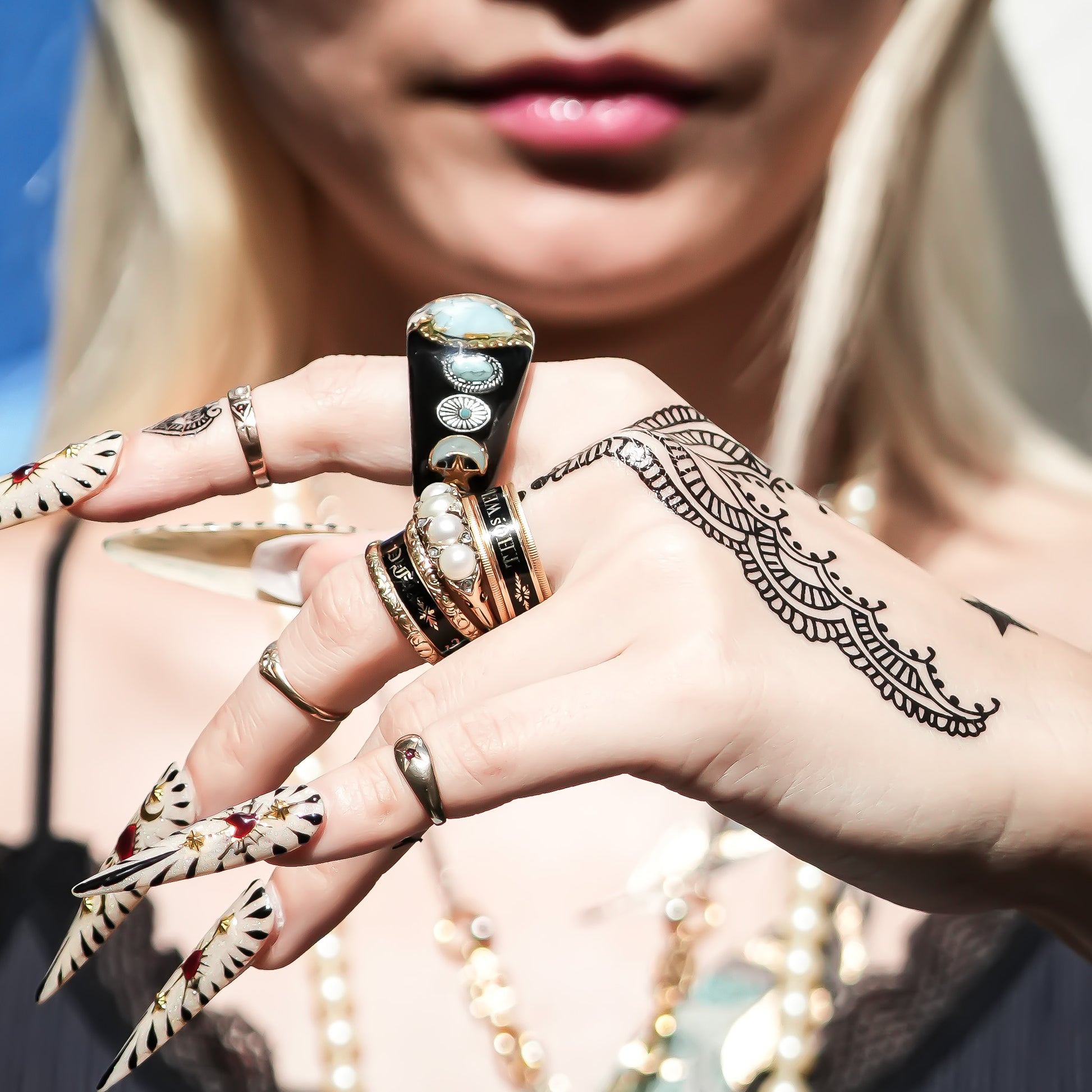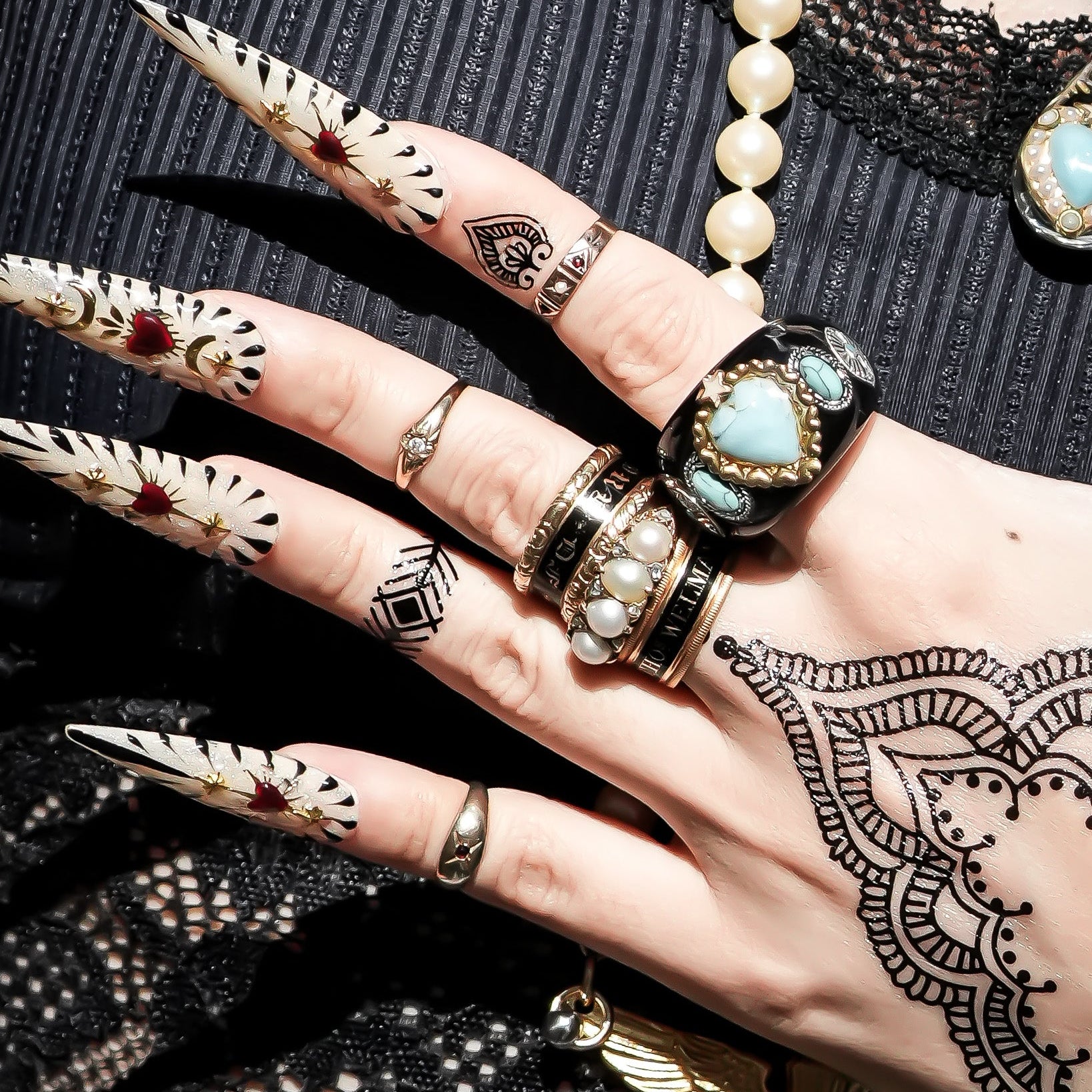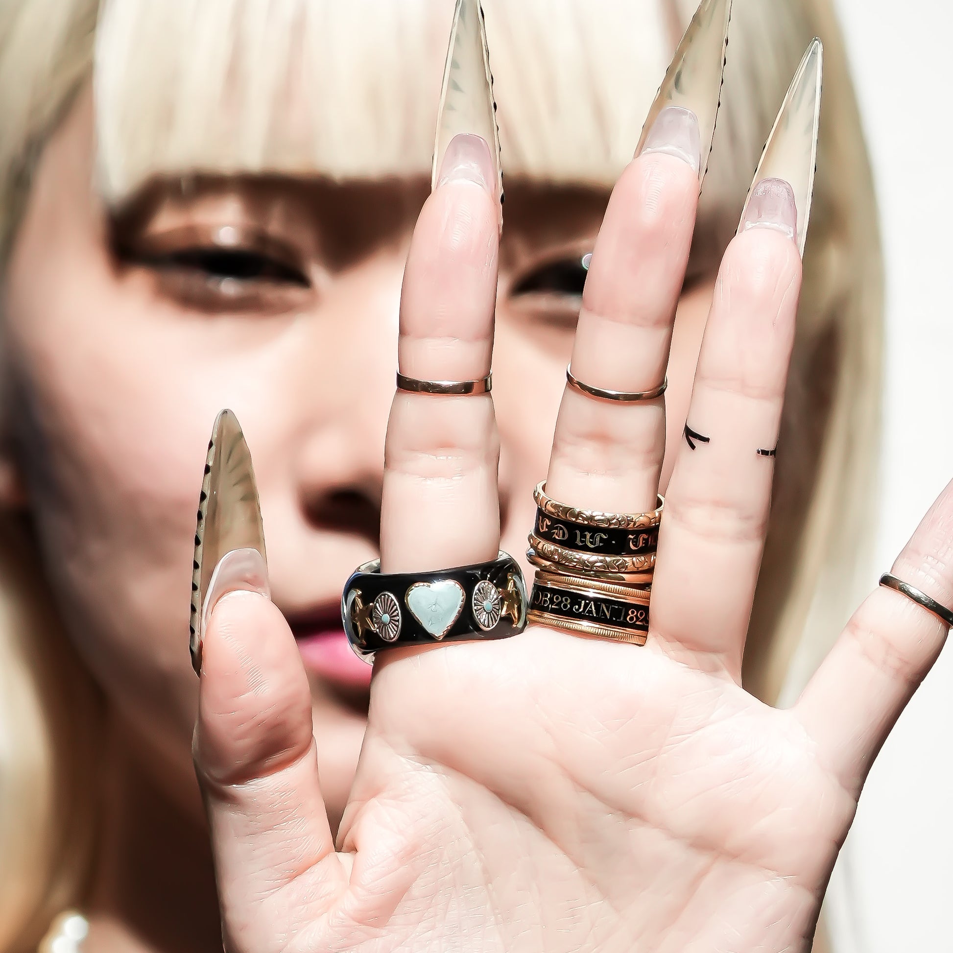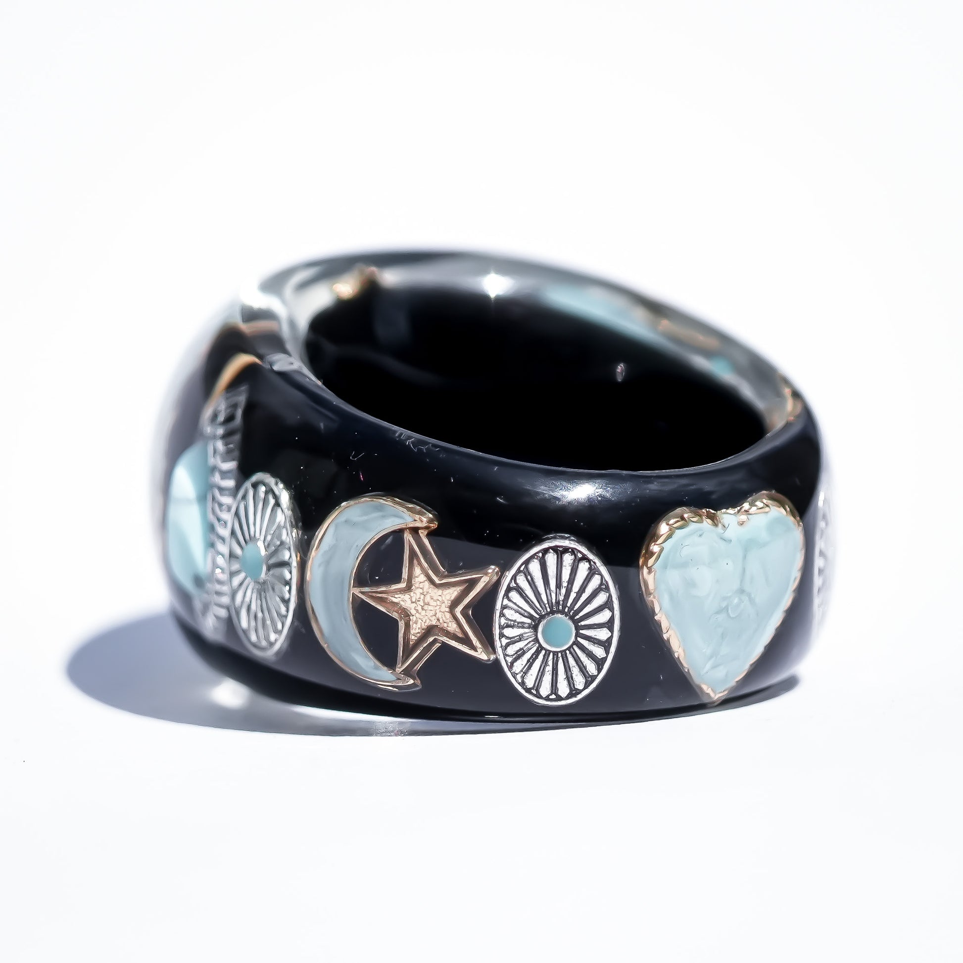 ハートモチーフでありながら、ブラックベースに月・星・サンバースト・ターコイズなどをちりばめ、甘さを抑えた“クールで力強い美しさ”を表現したシリーズです。