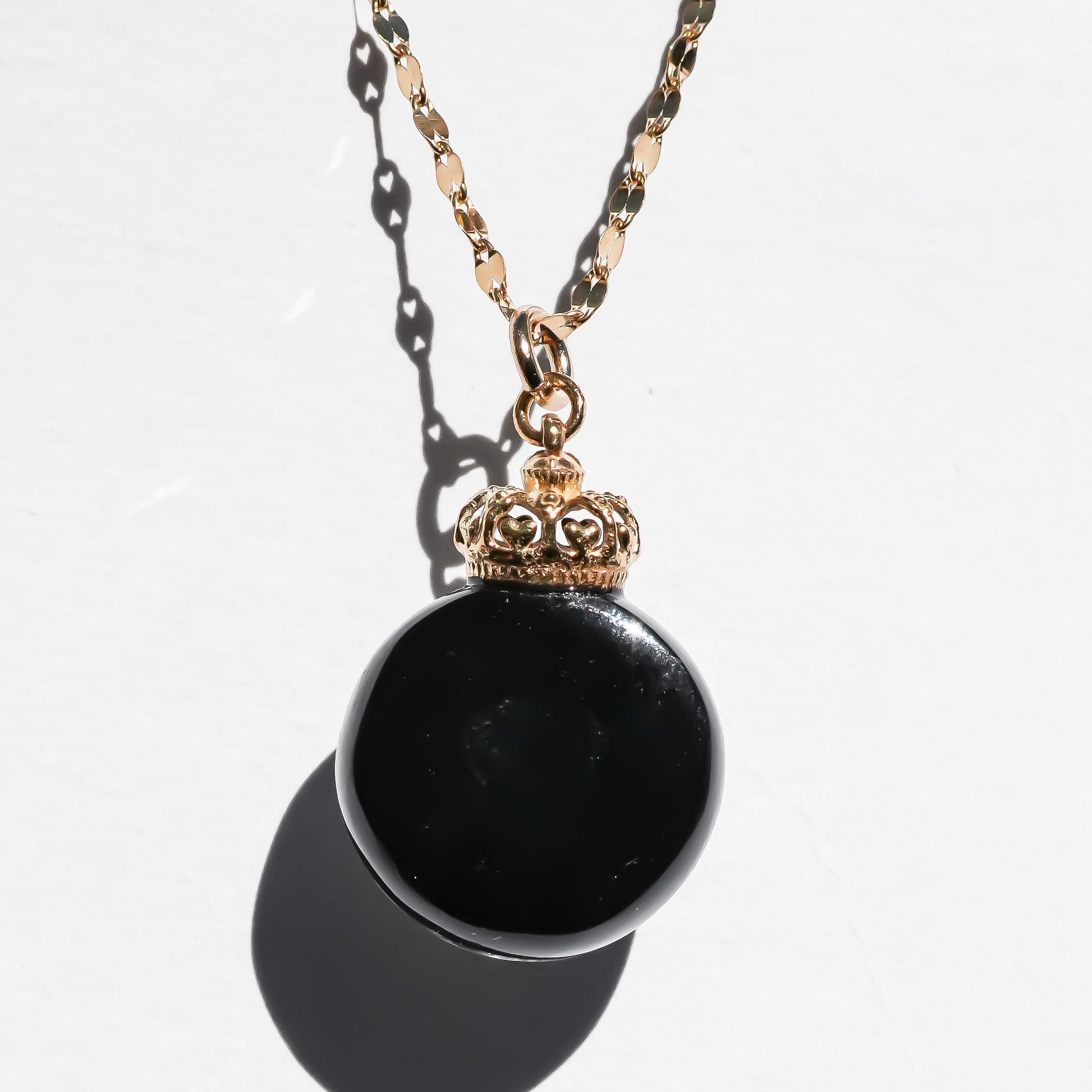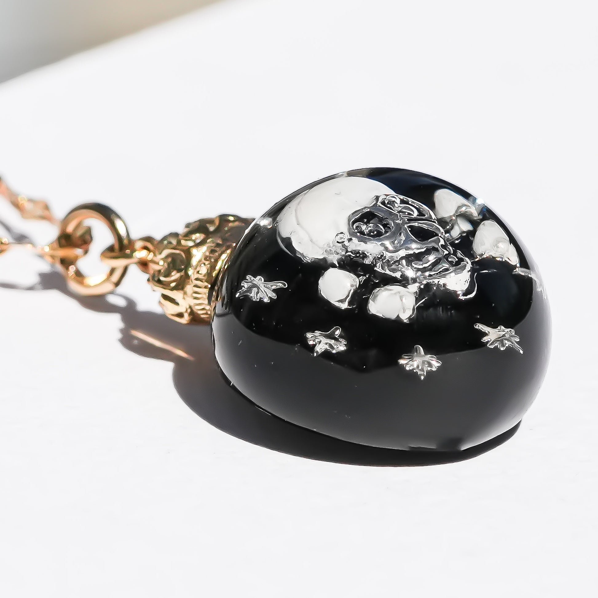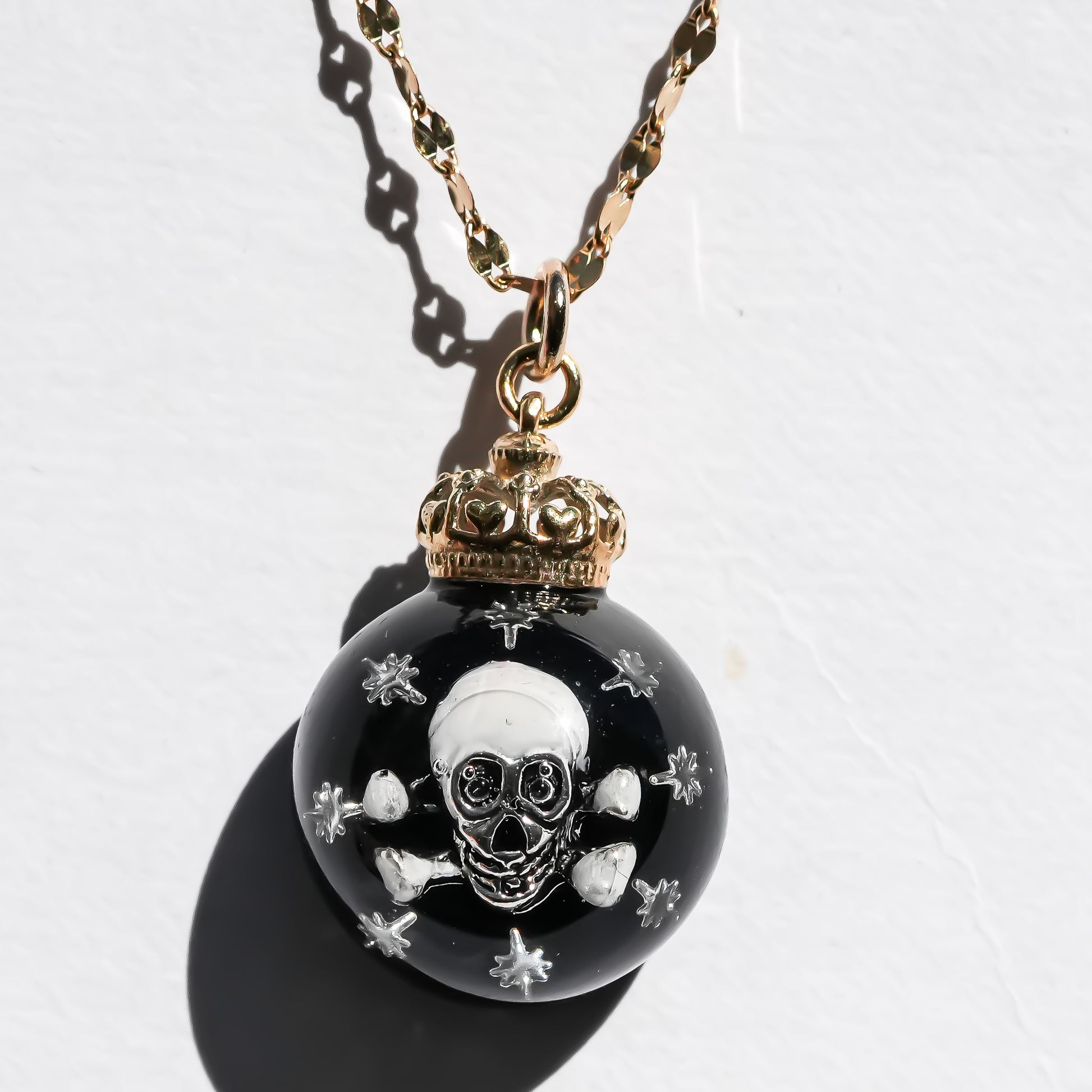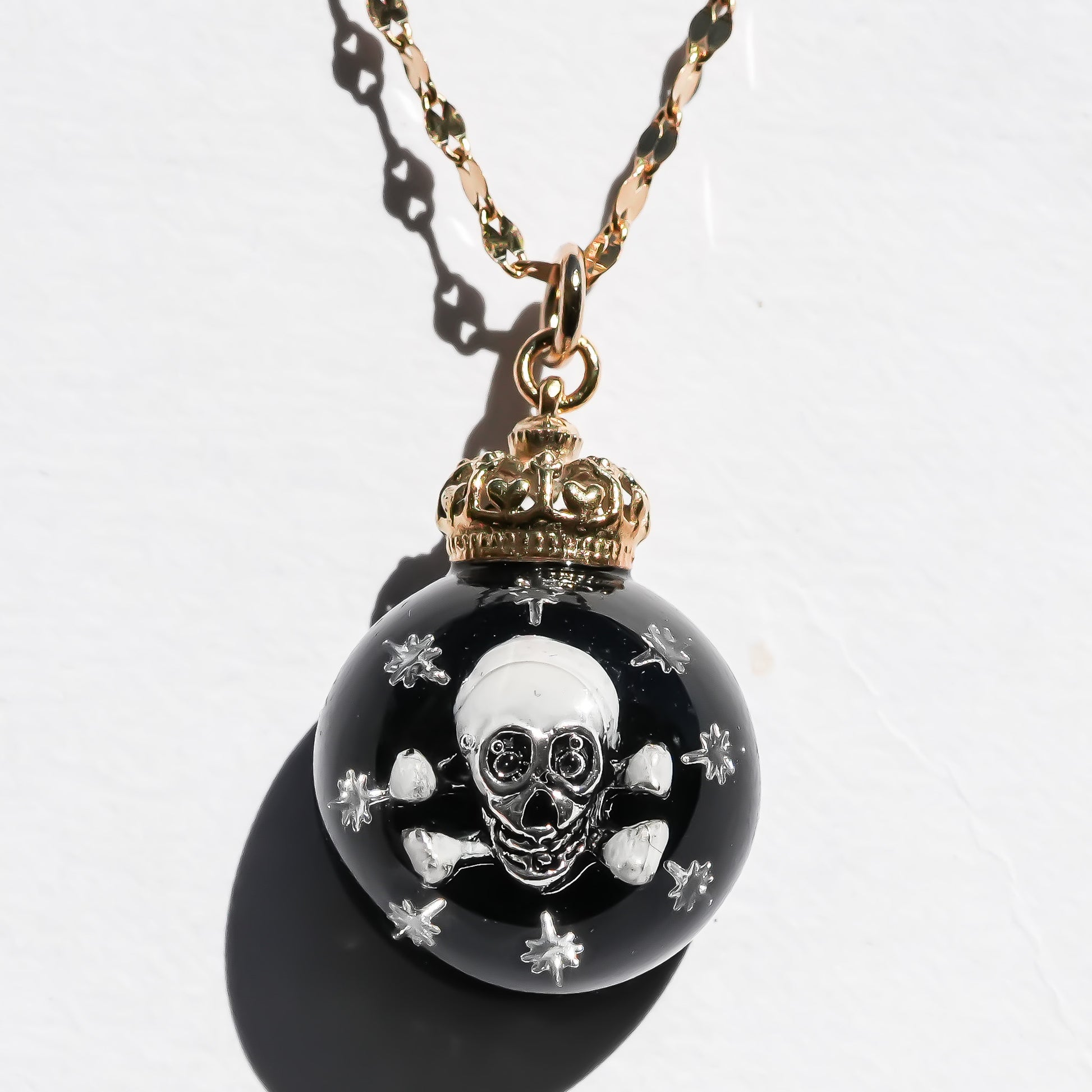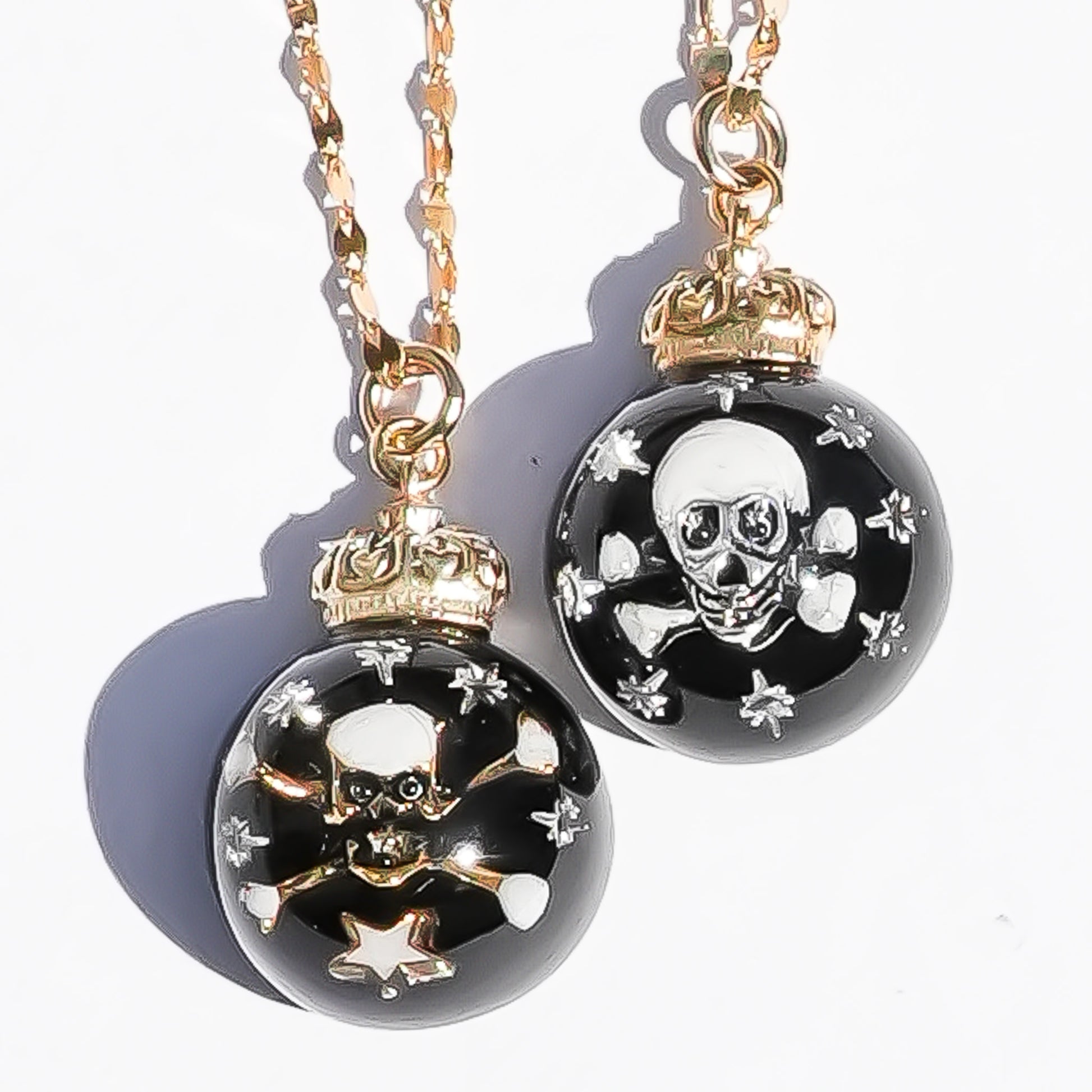 まるでクリスマスオーナメントをそのままジュエリーに仕立てたような、RUKAオリジナルのミニチュアオーナメントネックレス。艶やかな黒のレジンの中に浮かぶのは、**メメントモリ="死を想え"**の象徴、スカルとクロスボーン。シルバー&ゴールドの輝きが絶妙な立体感を放ちます。